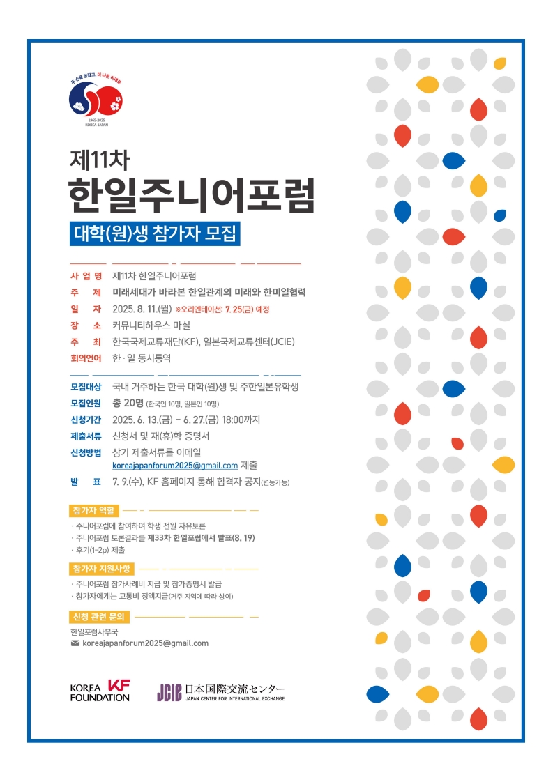 한국국제교류재단(Korea Foundation: KF)에서는 제11차 한일포럼을 개최하고, 동 포럼의 연계사업으로 제11차 한일주니어포럼을 개최할 예정입니다.