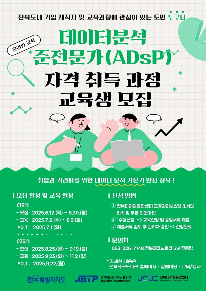 데이터분석 준전문가(ADsP) 자격 취득 과정 교육(온라인) : https://www.jbtp.or.kr/board/view.jbtp?menuCd=DOM_000000101003000000&boardId=BBS_0000003&dataSid=18293