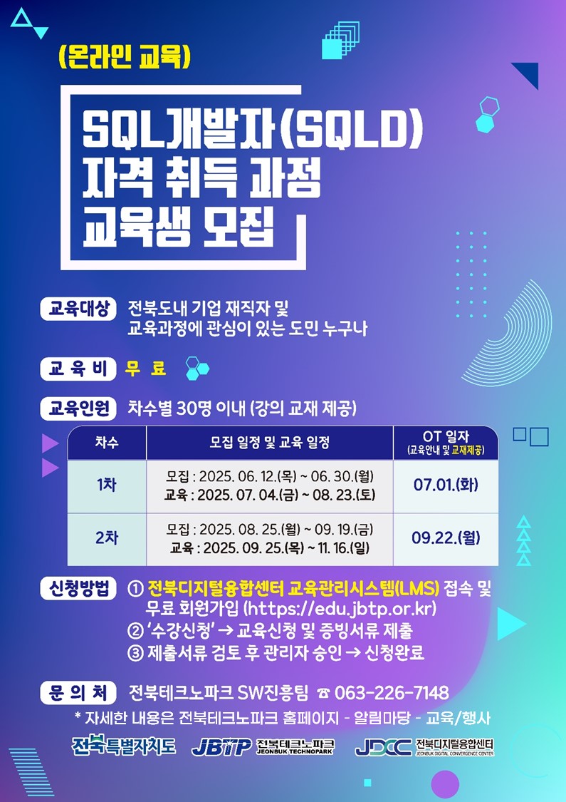 SQL 개발자(SQLD) 자격증 취득 과정 교육(온라인) : https://www.jbtp.or.kr/board/view.jbtp?menuCd=DOM_000000101003000000&boardId=BBS_0000003&dataSid=18294