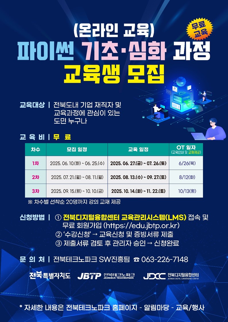 파이썬 기초 심화 과정 교육(온라인) : https://www.jbtp.or.kr/board/view.jbtp?menuCd=DOM_000000101003000000&boardId=BBS_0000003&dataSid=18275