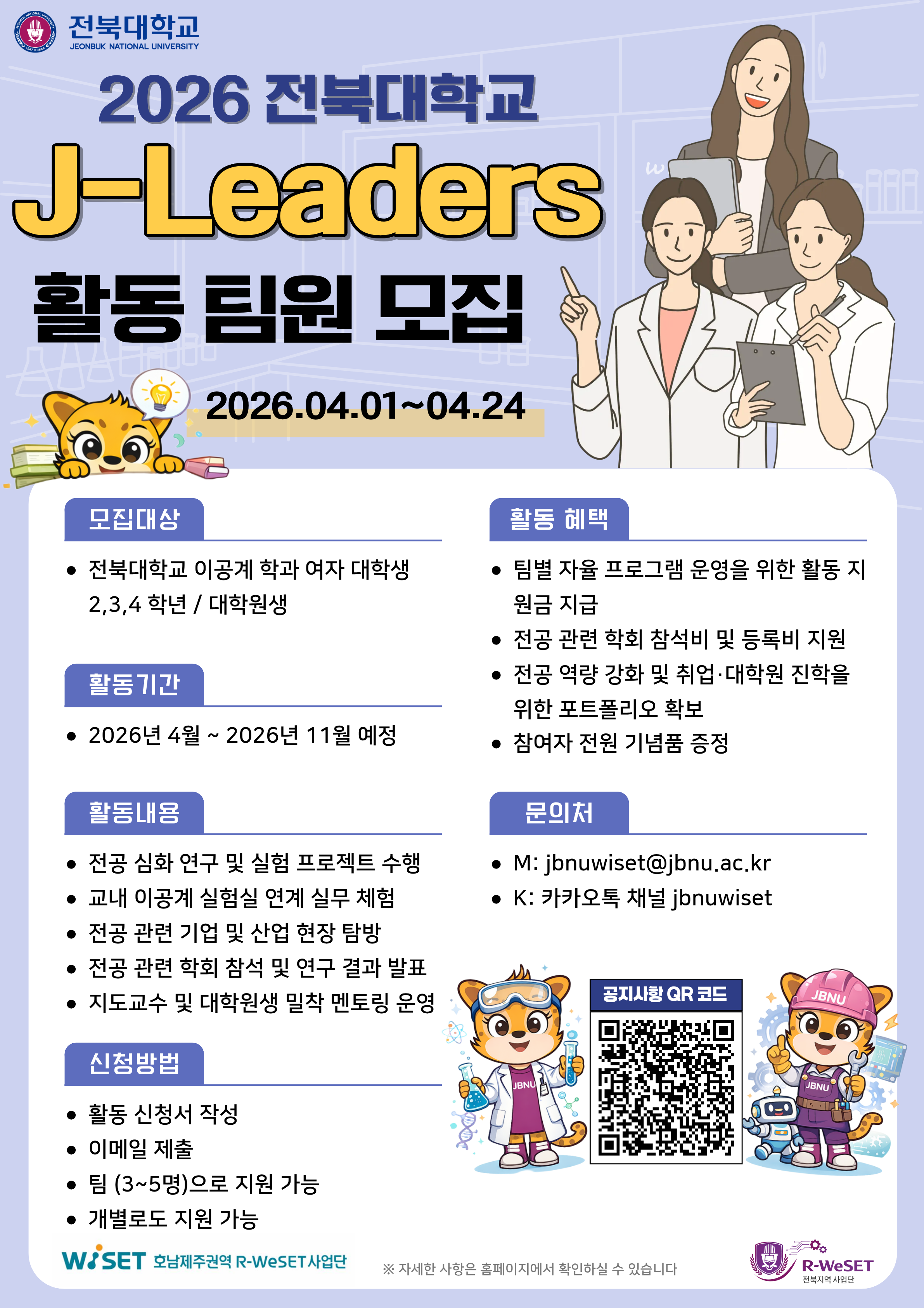 Meanwhile, as part of this project, JBNU will operate the "J-Leaders Program" to nurture the next generation of women leaders in science and technology. JBNU is recruiting team members among female students in JBNU STEM departments (undergraduate years 2–4 and graduate students) until April 24.