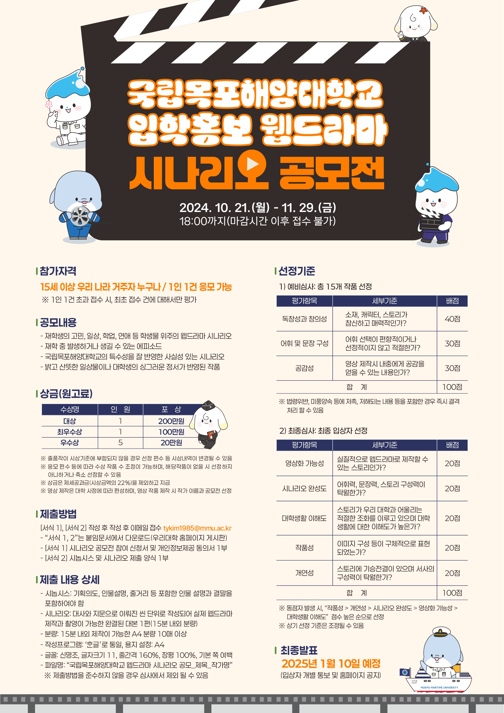 국립목포해양대학교에서 웹드라마 시나리오 공모전을 개최합니다. 관심있는 학생들의 많은 참여 바랍니다.