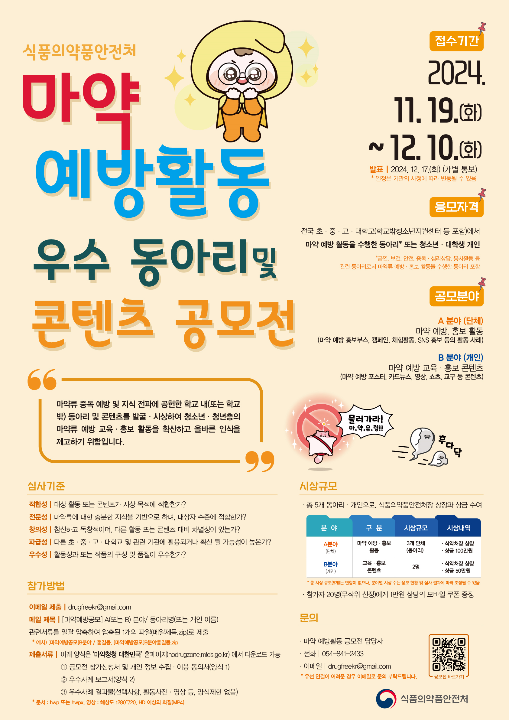 식품의약품안전처에서 「2024년 마약 예방활동 우수 동아리 공모전」을 개최합니다. 관심있는 학생들은 많은 참여바랍니다.