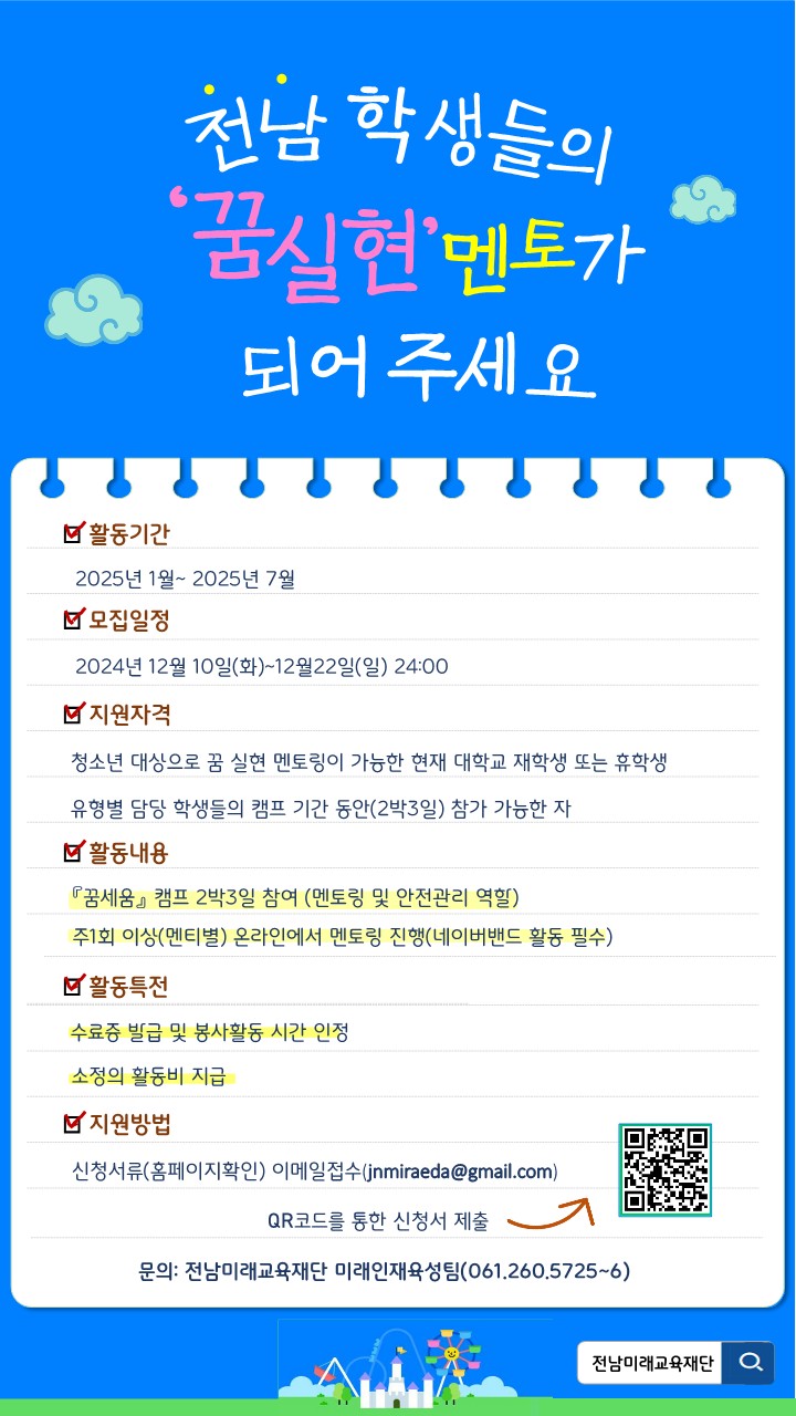 전남미래교육재단에서는 2025 년 「꿈 실현금 인생학교」프로그램 대학생 멘토를 추가 모집합니다. 관심있는 학생들은 많은 참여 바랍니다.
