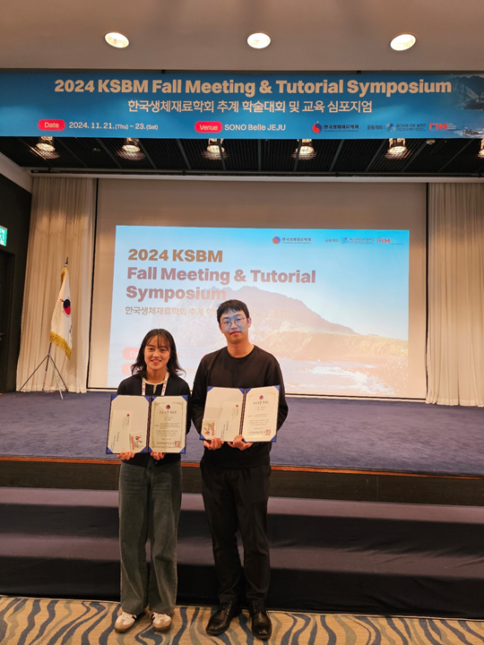 두 학생은 “연구실에서의 노력과 열정이 이번 학회에서 좋은 성과로 이어져 매우 뜻깊다”며, “생체재료 연구자로서 자긍심을 느끼고 더 나아가 성장할 수 있는 계기가 되었다”고 소감을 밝혔다. 이어 “연구를 지원해주신 지도교수님과 함께 노력한 연구실 동료들에게 감사드린다”고 말했다.