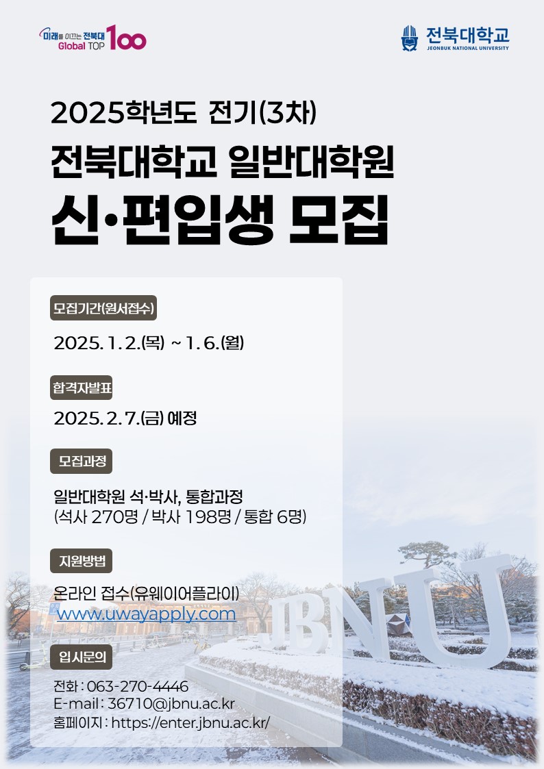 2025학년도 전기(3차) 대학원 신입생 모집 원서접수 바로가기(1.2.(목) 09:00부터)