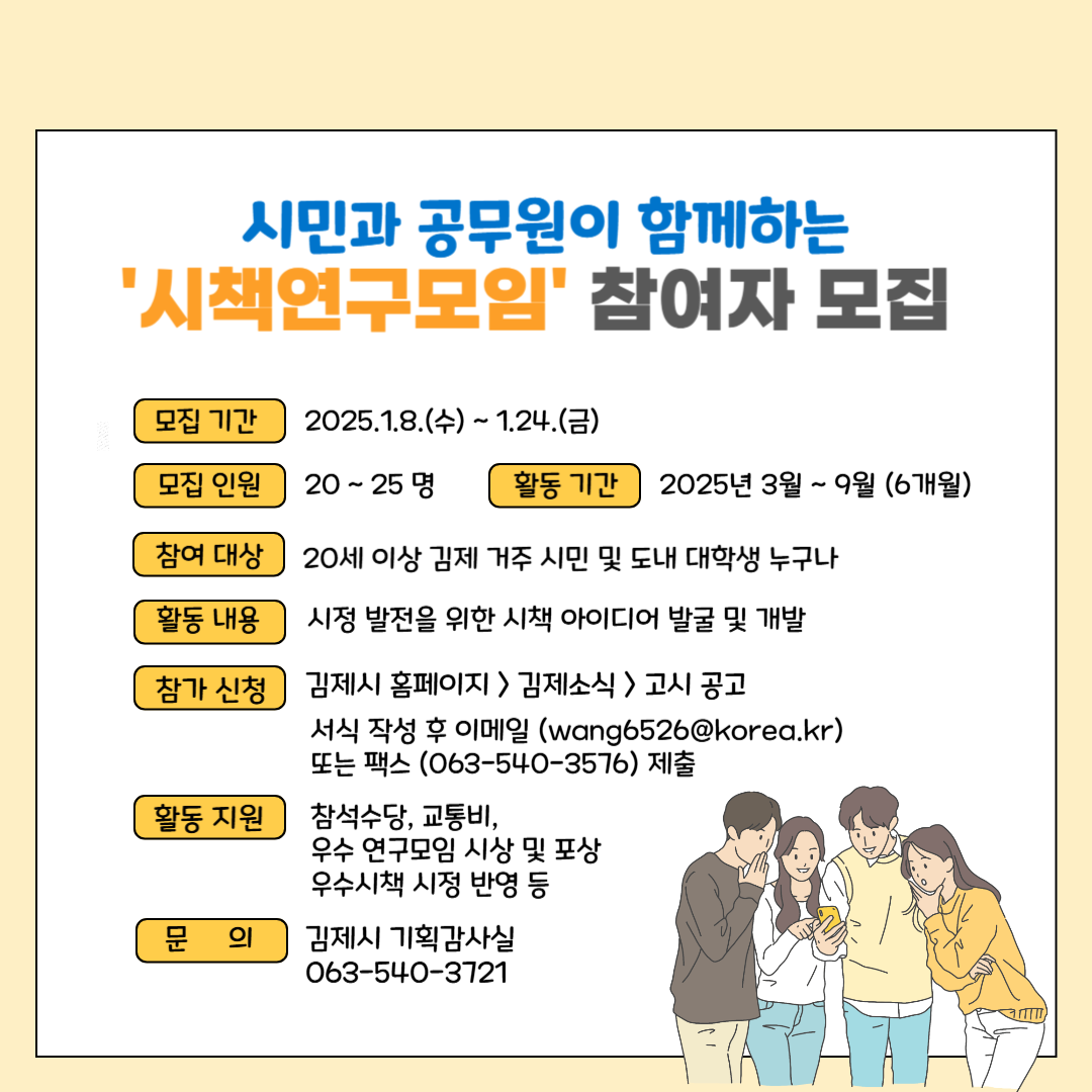 김제시에서는 시민과 공무원이 함께하는 '시책연구모임' 참여자를 모집한다고 합니다. 관심있는 학생들은 많은 참여 바랍니다.