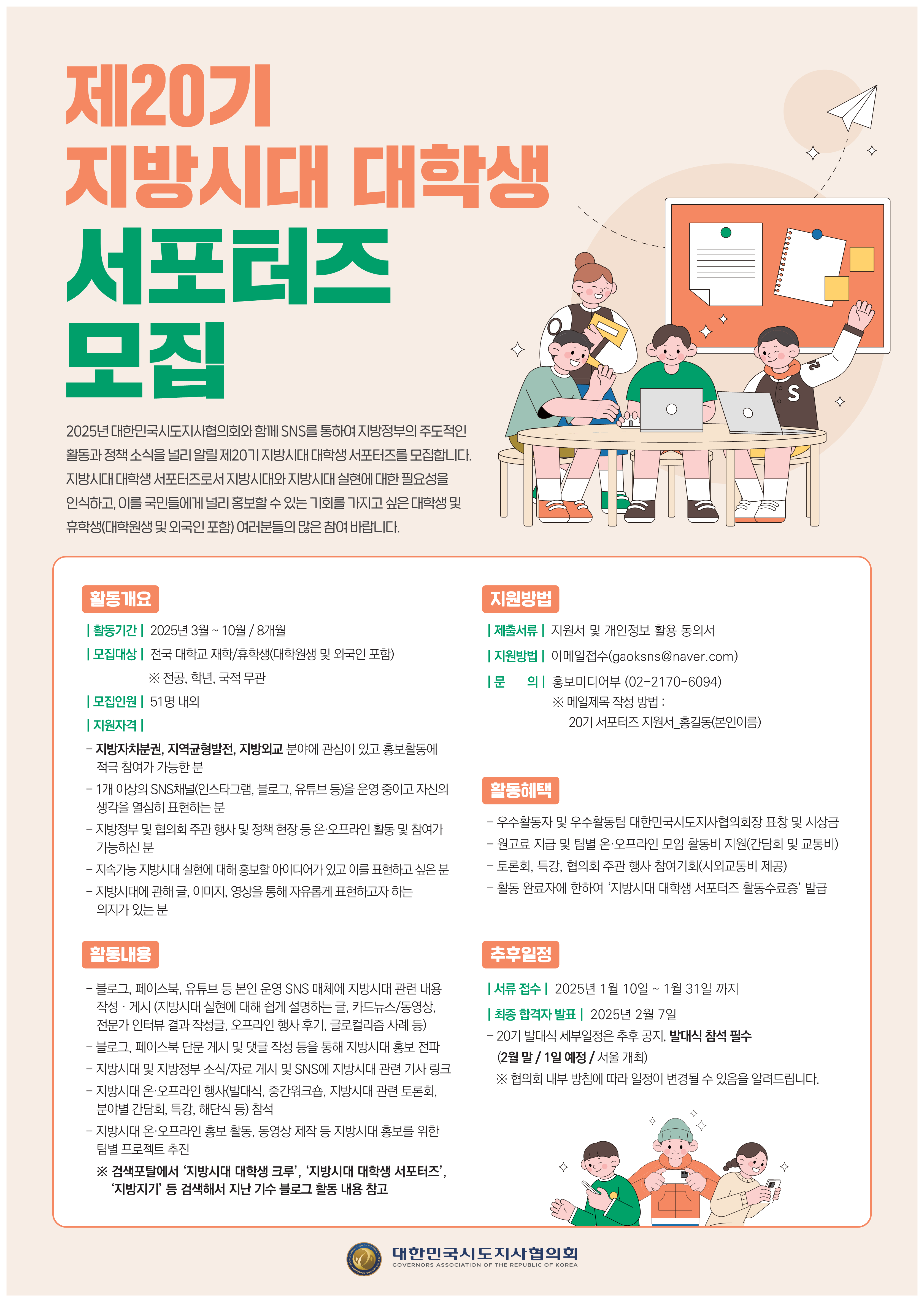 대한민국시도지사협의회에서는 「제20기 지방시대 대학생 서포터즈」를 모집한다고 합니다. 관심있는 학생들은 많은 참여 바랍니다.