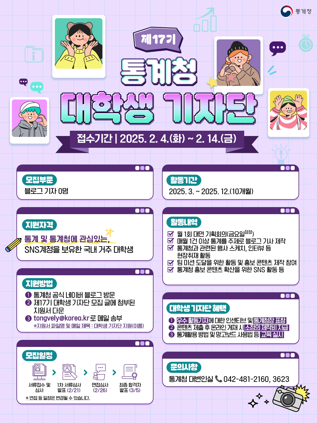 통계청에서는 2025년 제17기 통계청 대학생 기자단을 모집한다고 합니다. 관심있는 학생들은 많은 참여 바랍니다.