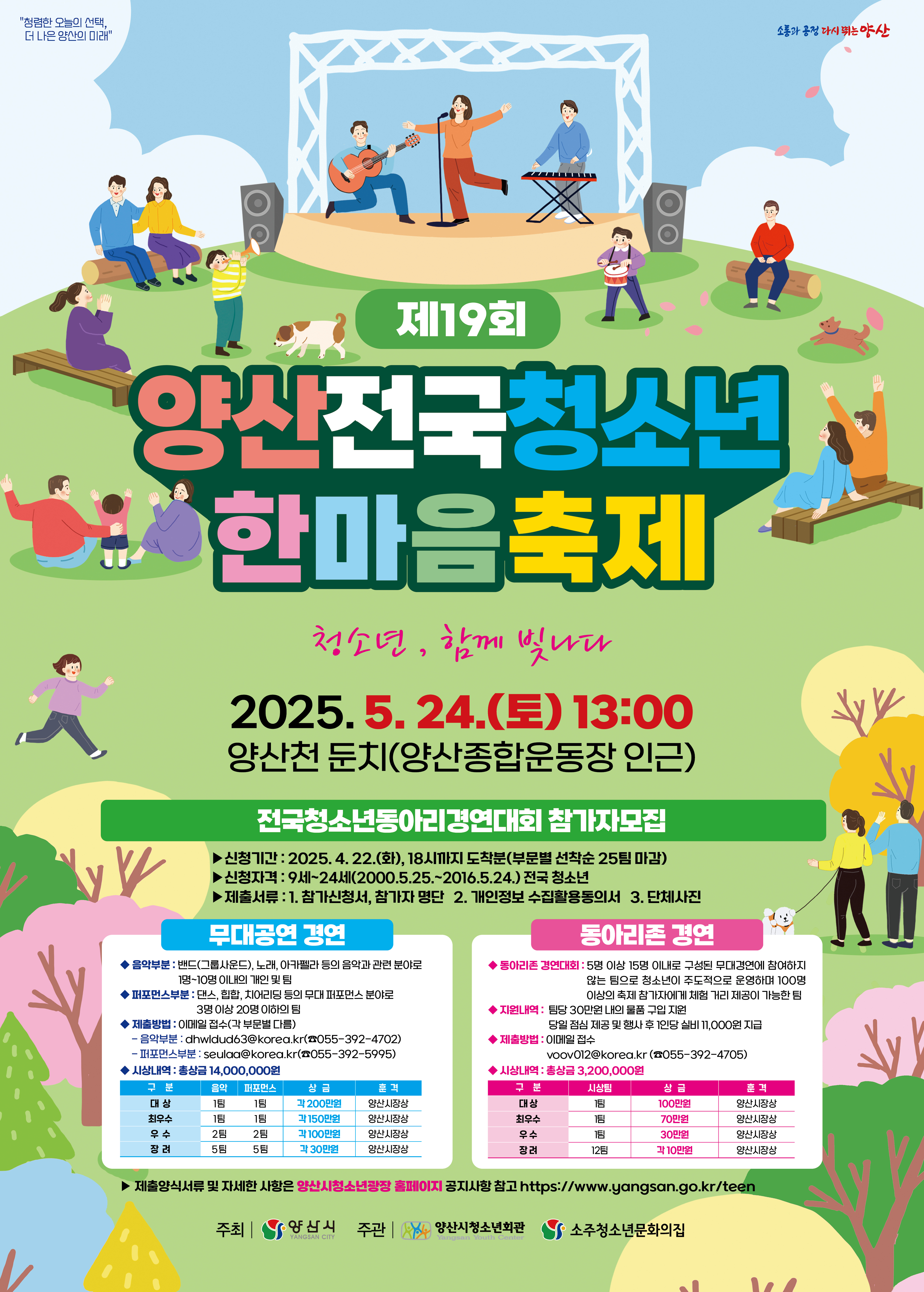 양산시에서 『제19회 양산전국청소년한마음축제』 청소년동아리경연대회 등 행사를 개최한다고 합니다. 관심있는 학생들은 많은 참여 바랍니다.