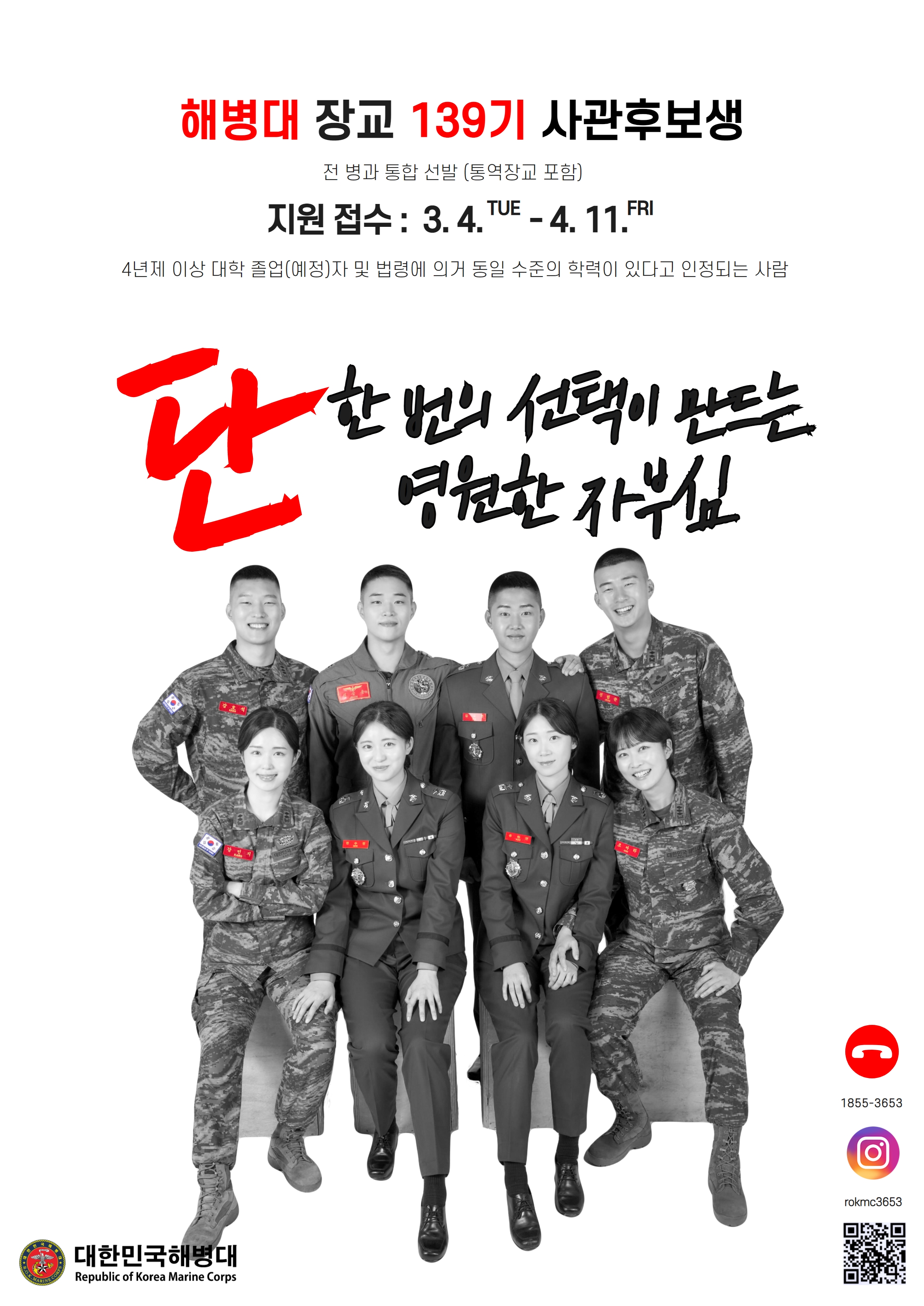 해병대사령부에서 제139기 사관후보생(장교)을 모집한다고 합니다. 관심있는 학생들은 많은 신청 바랍니다.
