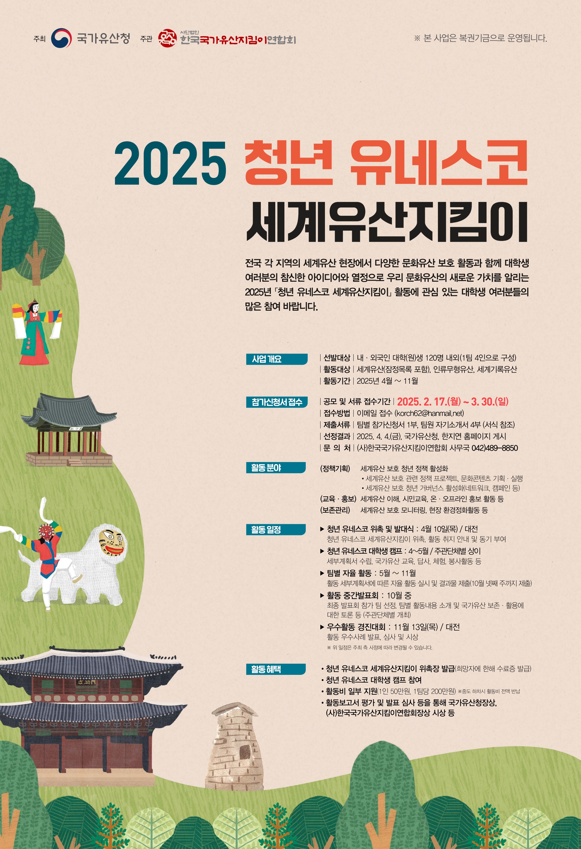 대동문화재단에서 2025년도 청년 유네스코 세계유산 지킴이 참여자를 모집합니다. 관심있는 학생들은 많은 참여 바랍니다.