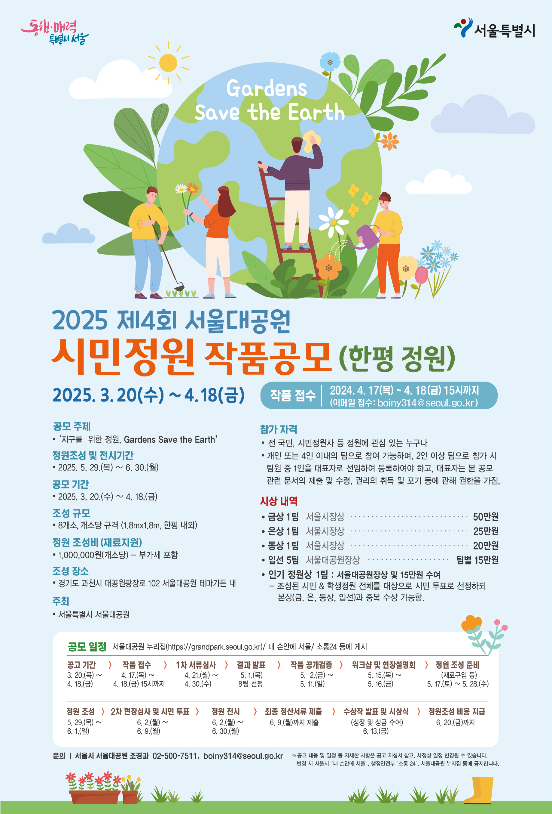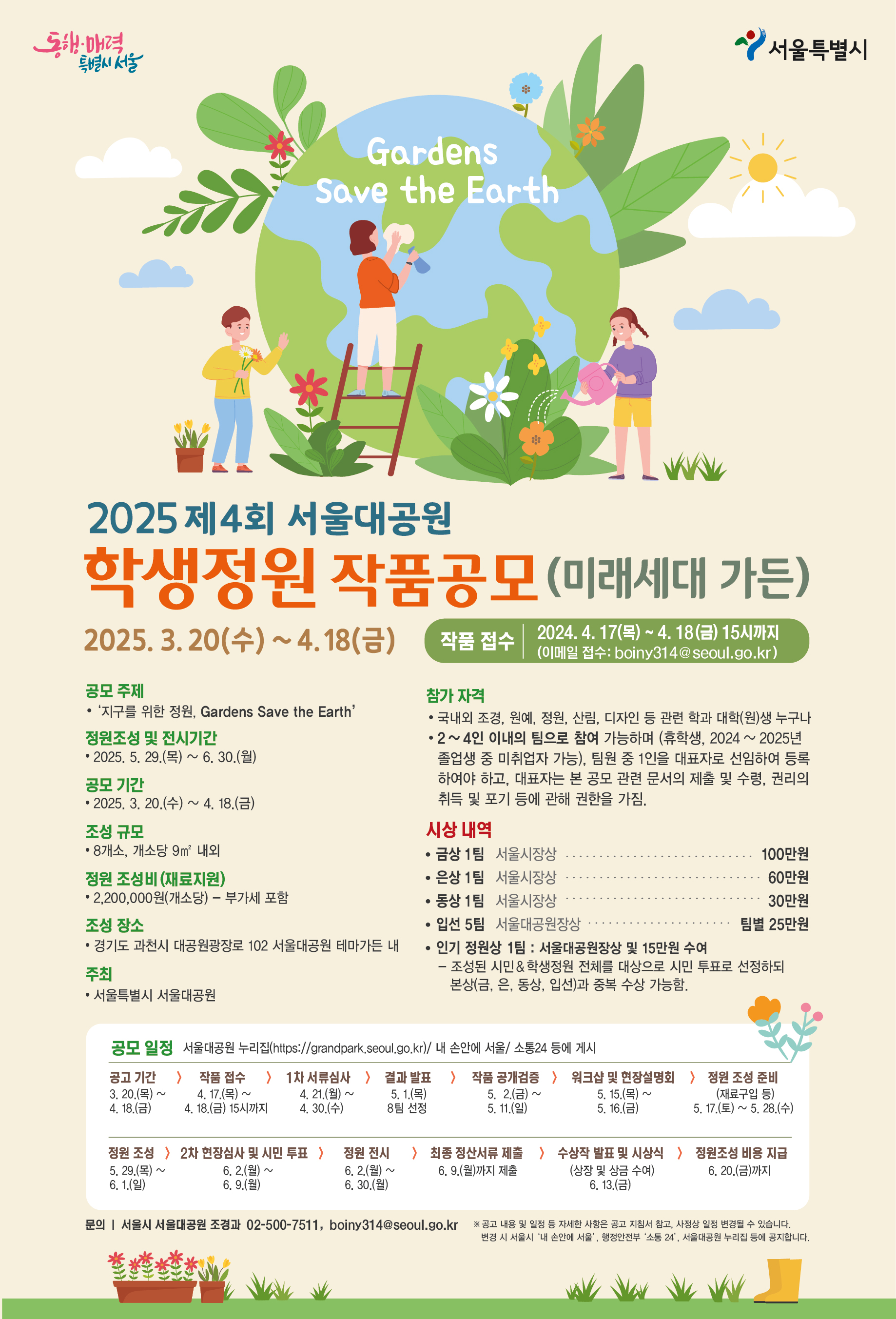 서울대공원에서 「2025년 제4회 서울대공원 학생정원 작품공모」를 개최한다고 합니다. 관심있는 학생들은 많은 참여 바랍니다.