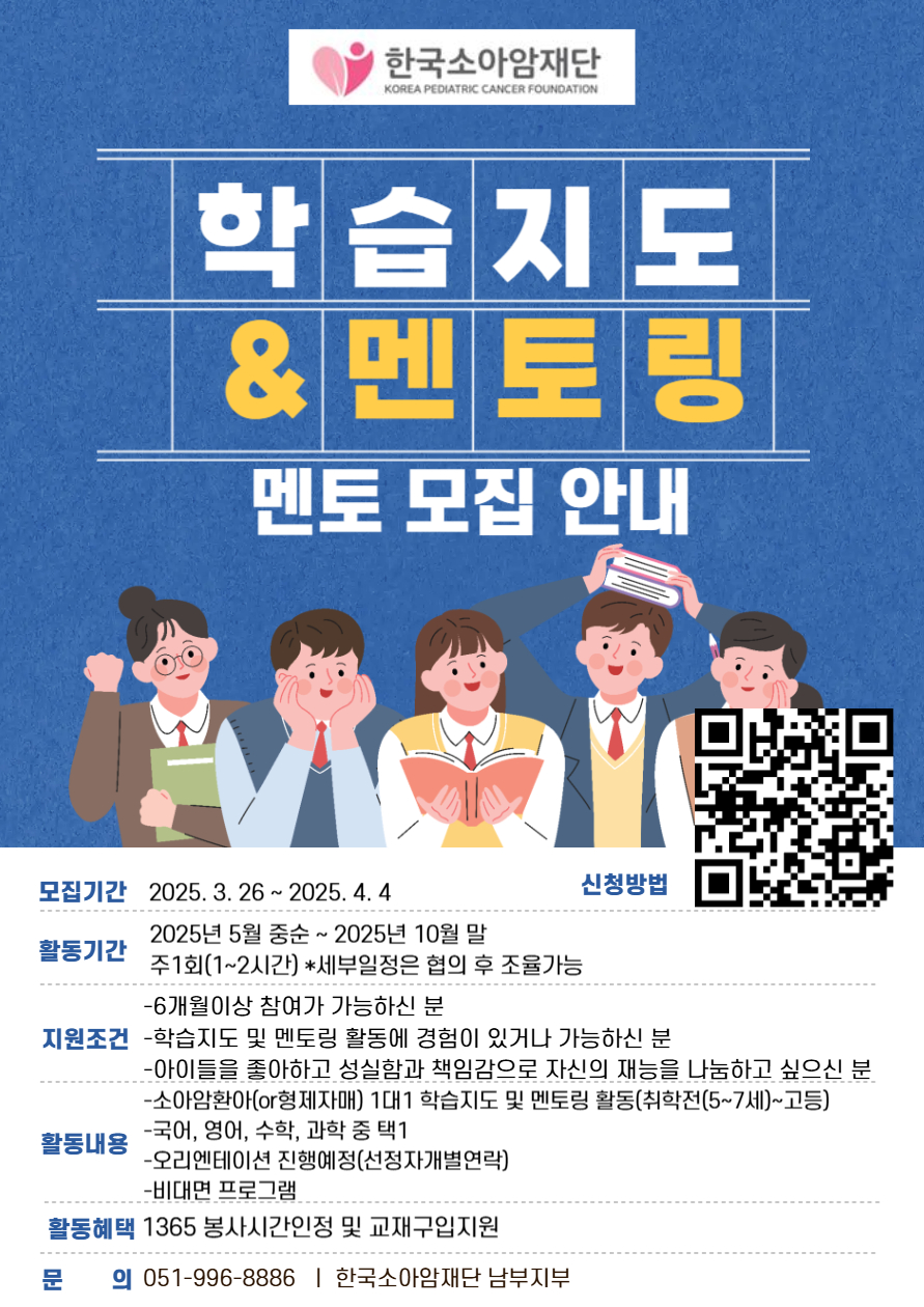 한국소아암재단에서 학습지도&멘토링 멘토 모집을 합니다. 관심 있는 학생들은 많은 참여 바랍니다.