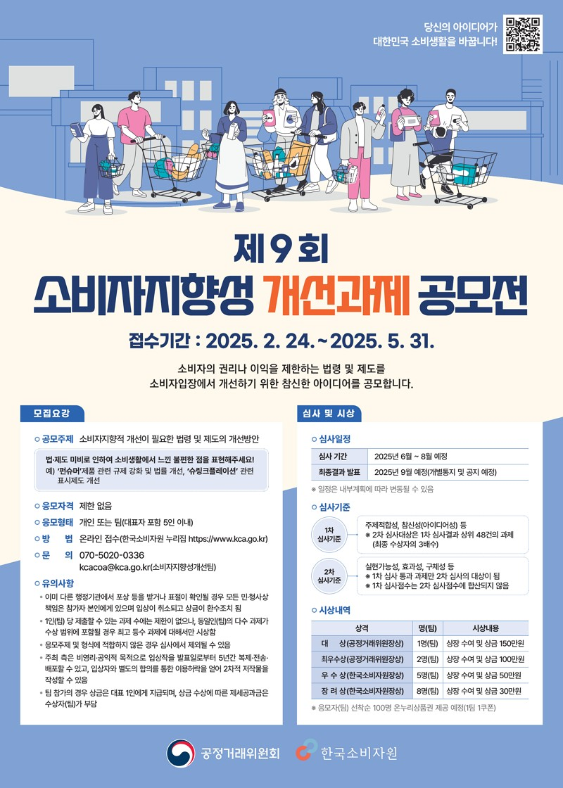 한국소비자원에서 제9회 소비자지향성 개선과제 공모전을 개최합니다. 관심있는 학생들은 많은 참여 바랍니다.
