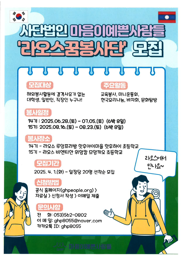 사단법인마음이예쁜사람들에서 2025년도 마음이예쁜사람들 라오스꿈봉사단을 모집합니다. 관심있는 학생들은 참여 바랍니다.