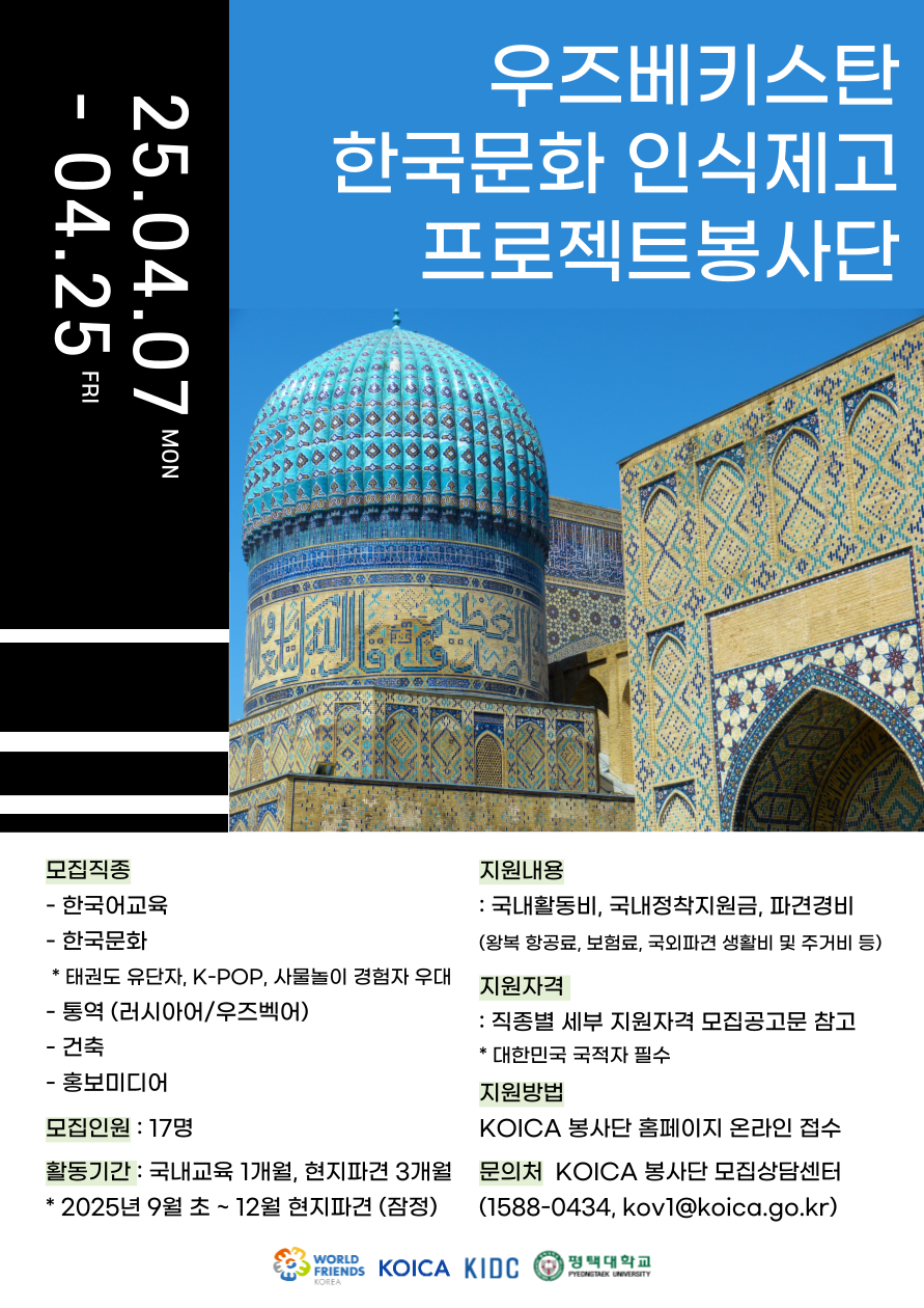 KOICA 우즈베키스탄 타슈켄트 지역 한국문화 인식제고 프로젝트 봉사단(3기) 모집 안내드립니다.