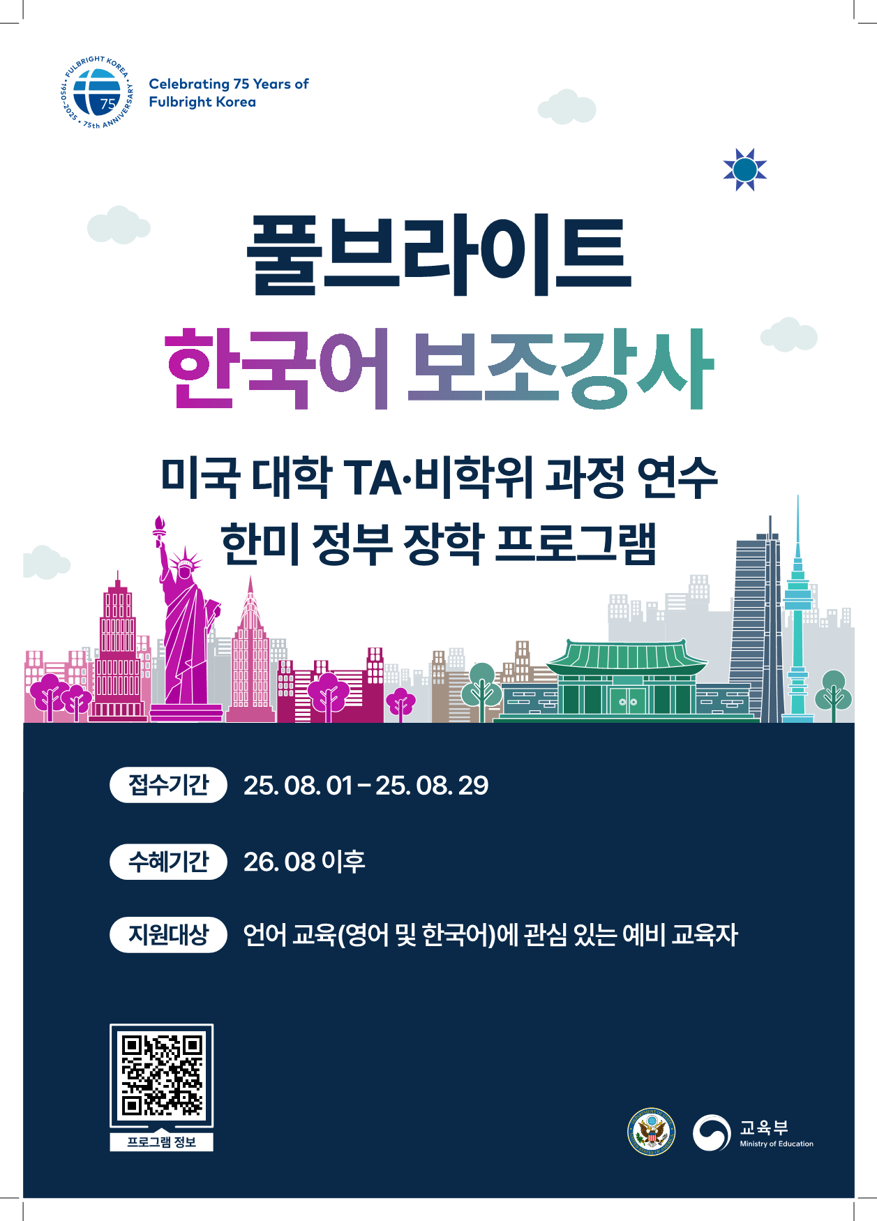 한미교육위원단에서 2026-27년도 풀브라이트 미국 대학 한국어 보조강사(FLTA) 프로그램을 운영합니다. 관심있는 학생들은 첨부파일을 확인하시고 많은 참여 바랍니다.