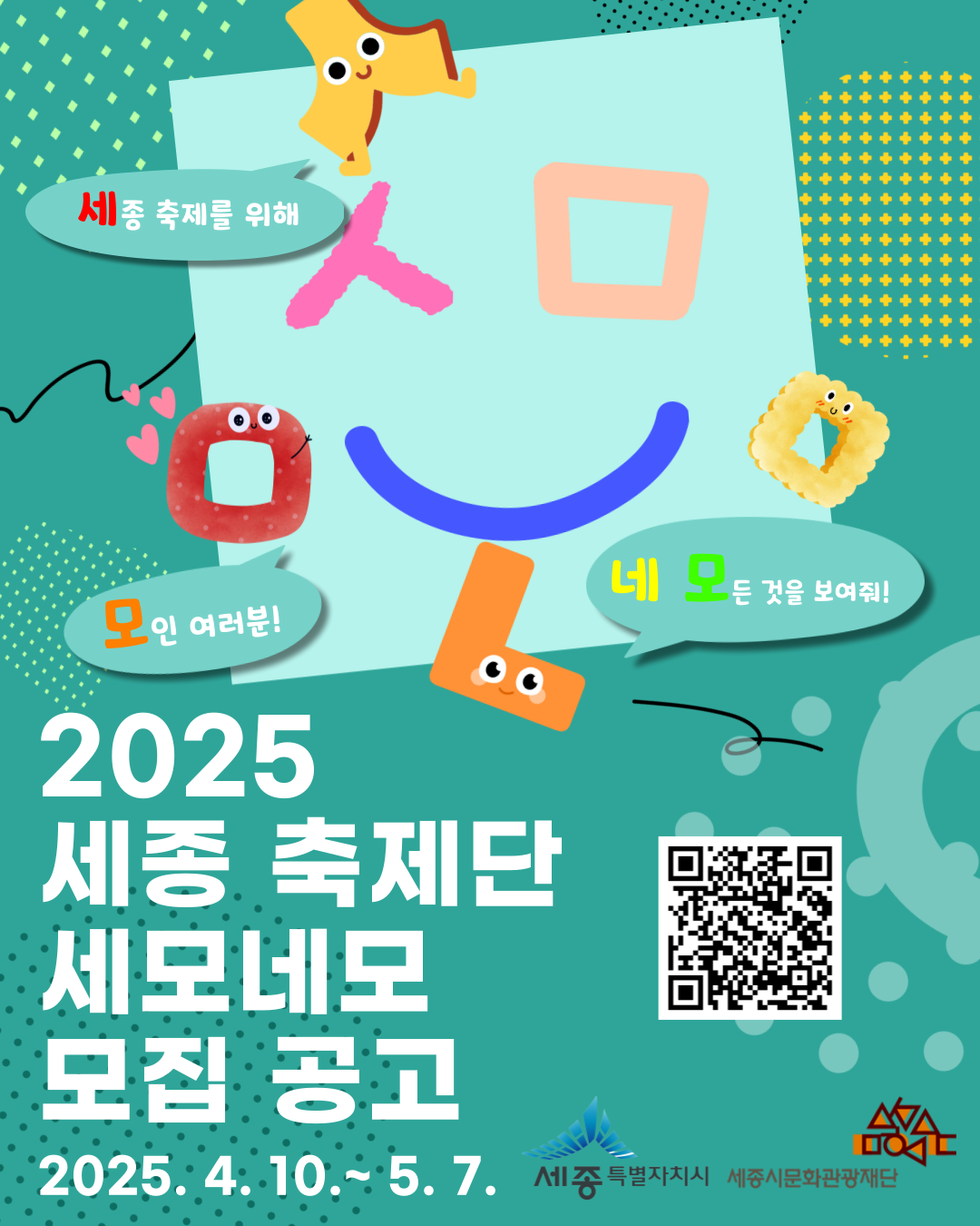 세종시문화관광재단에서 2025 세종축제단 세모네모를 모집합니다. 관심있는 학생들은 많은 참여바랍니다.