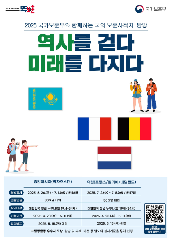 국가보훈부에서 2025년 국외 보훈사적지 탐방 참가자를 모집합니다. 관심있는 학생들은 많은 참여 바랍니다.