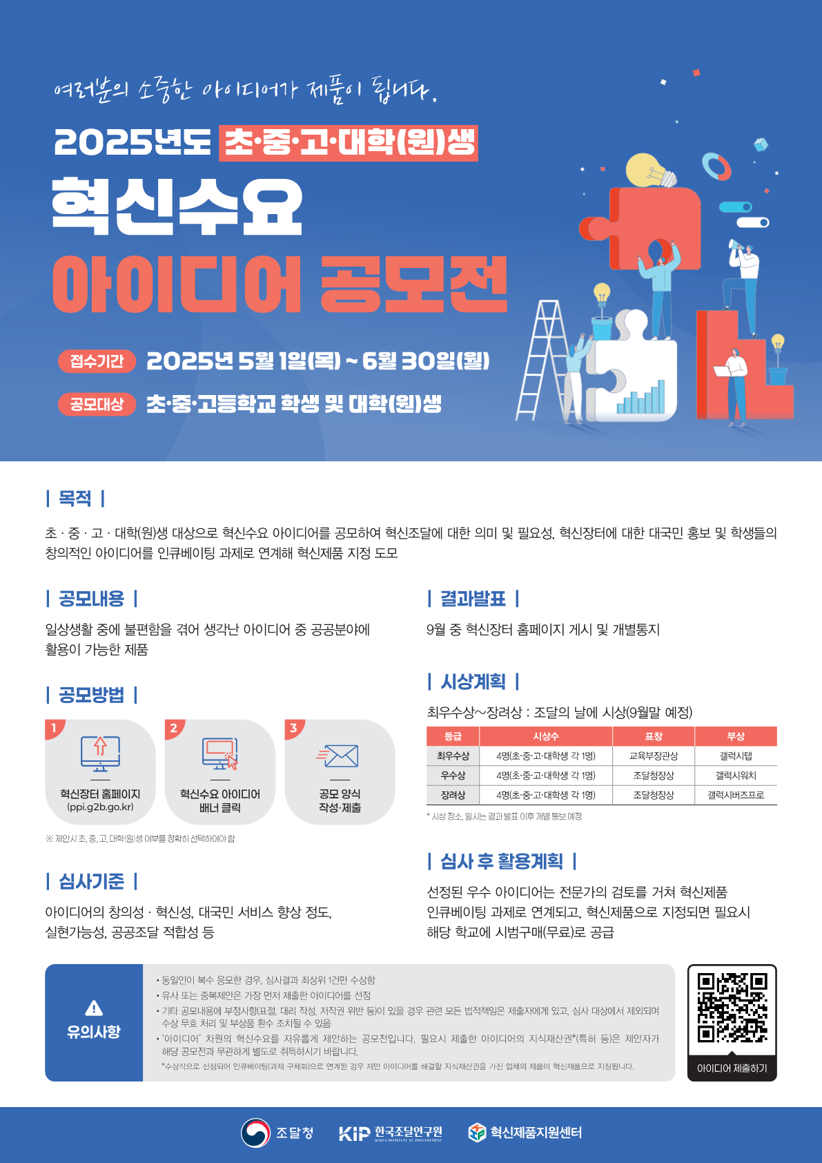 조달청에서 「2025년도 학생 혁신수요 아이디어 공모전」을 개최합니다. 관심있는 학생들은 많은 참여 바랍니다.