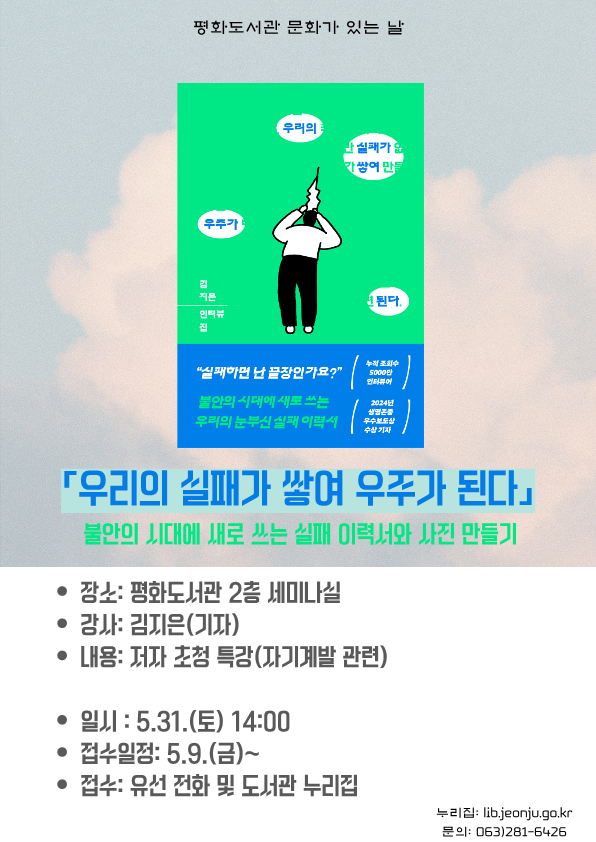 전주시에서 전주시립평화도서관 5월 문화가 있는 날 프로그램을 운영합니다. 관심있는 학생들은 많은 참여 바랍니다.