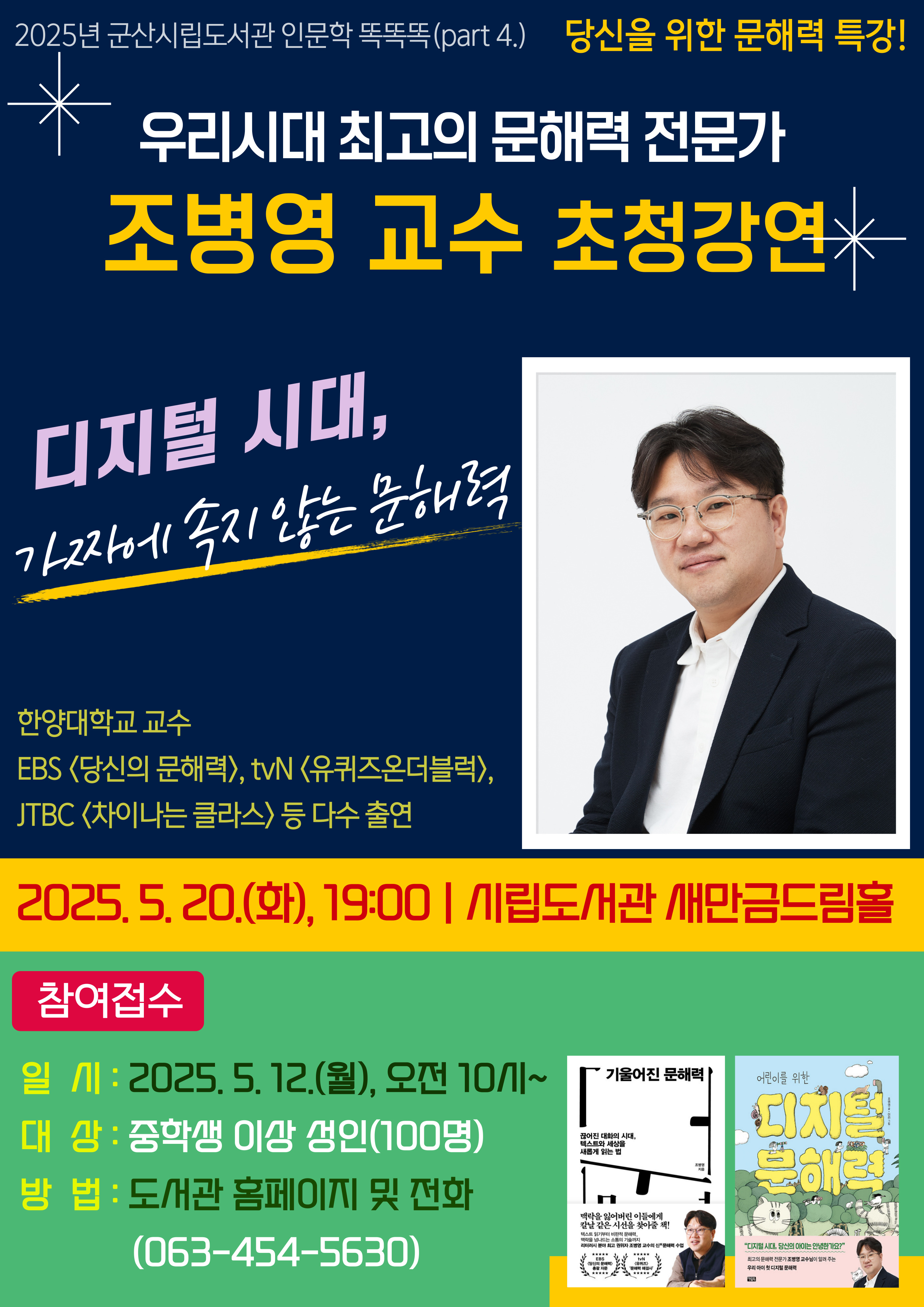 군산시 군산시립도서관에서 '조병영 교수 초청 문해력 특강'을 진행합니다. 관심있는 학생들은 많은 참여 바랍니다.