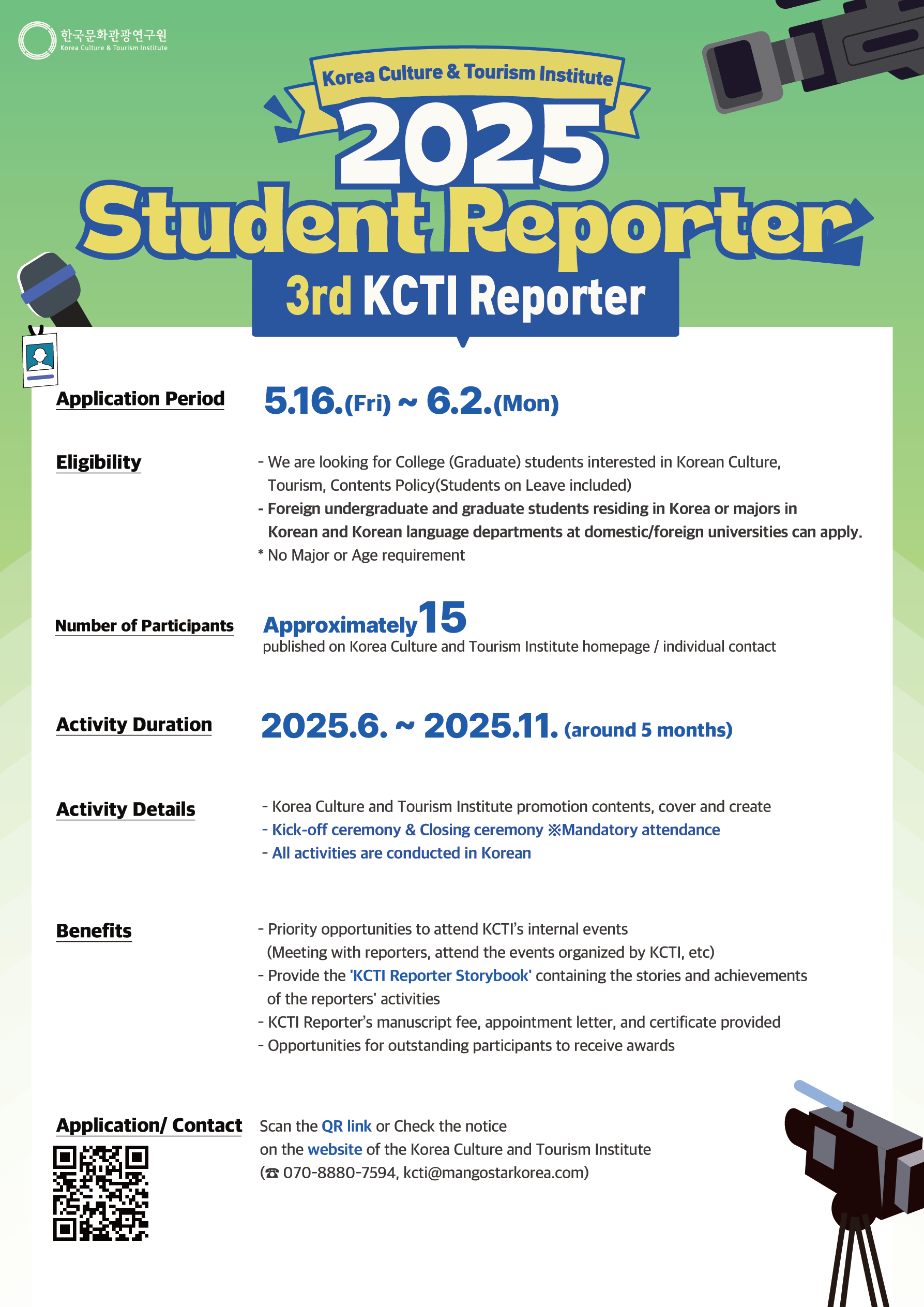 한국문화관광연구원에서 2025년 KCTI 대학생 기자단 제3기를 모집합니다. 관심있는 학생들은 많은 참여 바랍니다.