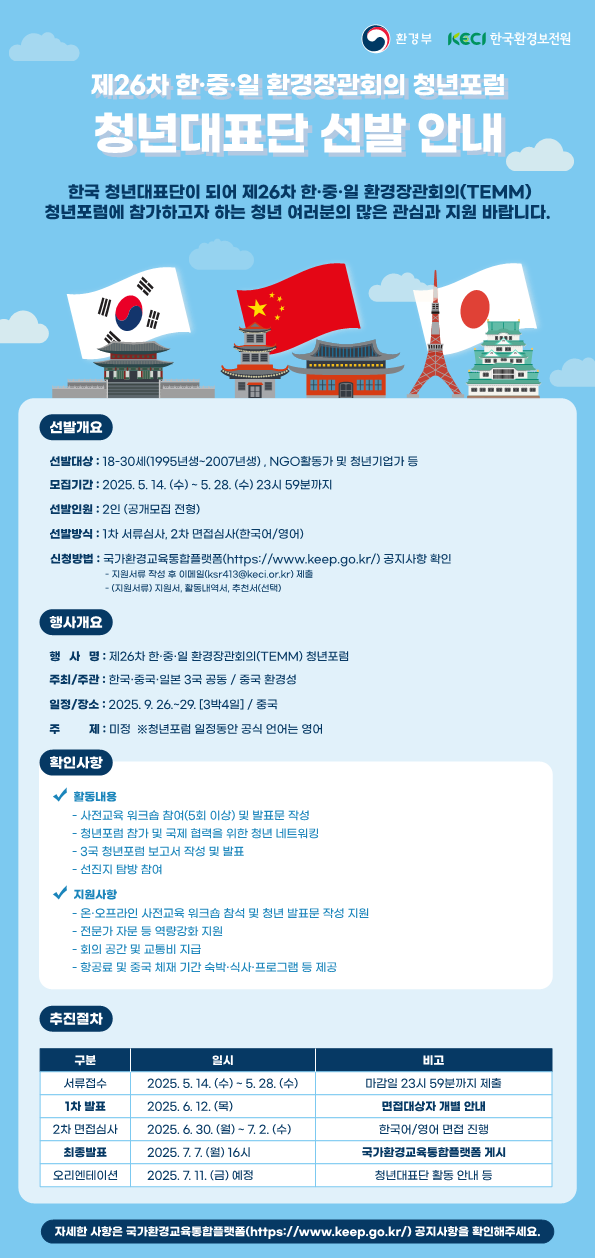 한국환경보전원에서 「제26차 한·중·일 환경장관회의(TEMM) 청년포럼」 청년대표단을 모집합니다. 관심있는 학생들은 많은 참여 바랍니다.