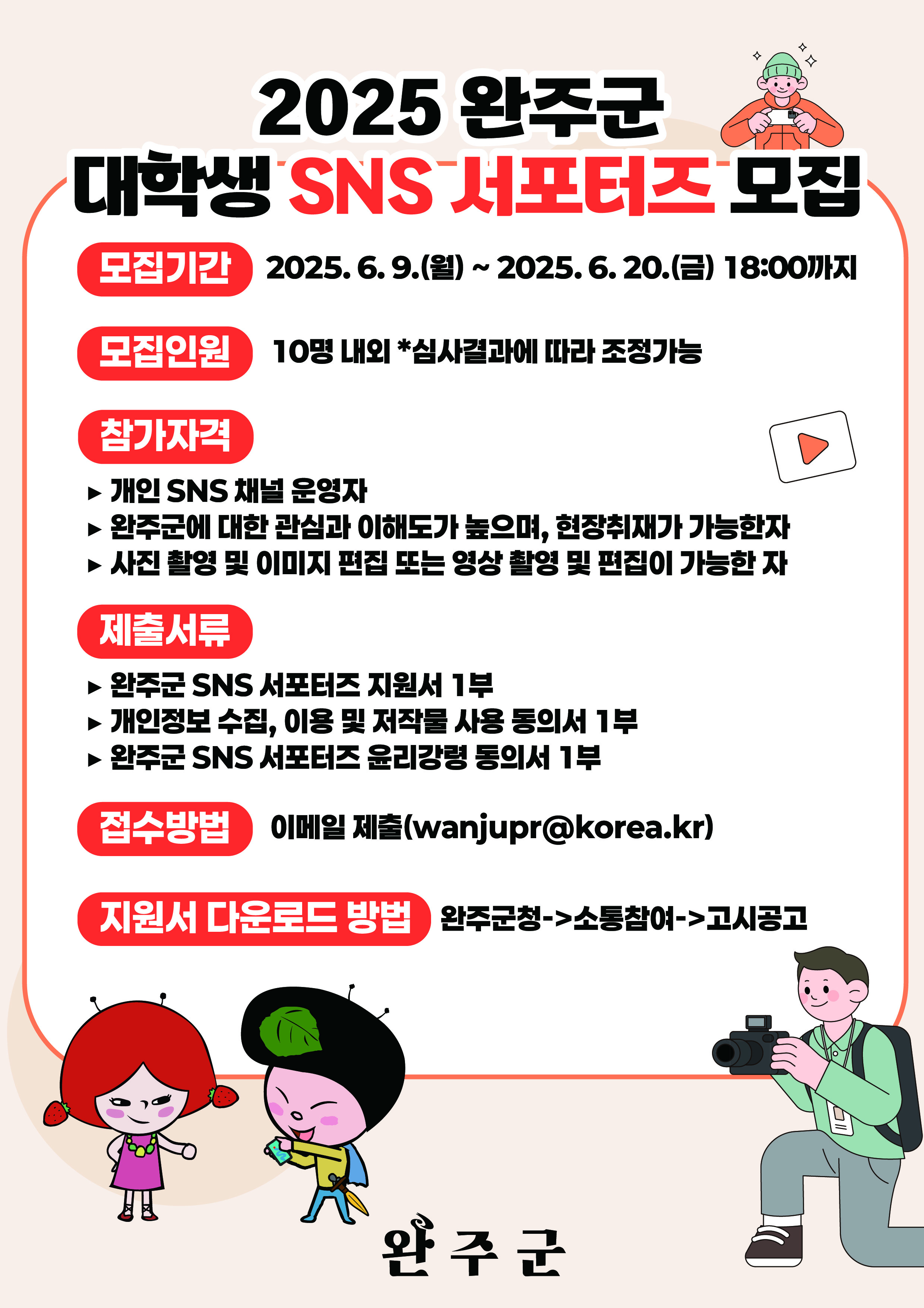 완주군에서 2025 대학생 SNS 서포터즈를 모집합니다. 관심있는 학생들은 많은 참여바랍니다.