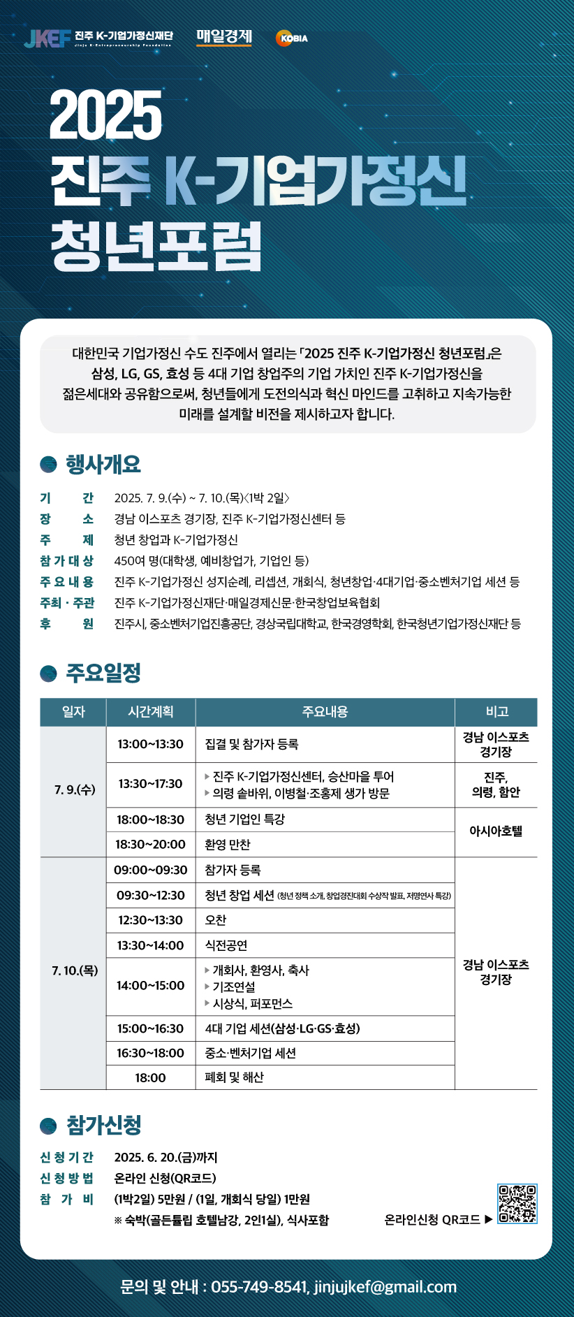 진주시에서 『2025 진주 K-기업가정신 청년포럼』 전국 대학생 참가자를 모집합니다. 관심있는 학생들은 많은 참여 바랍니다.