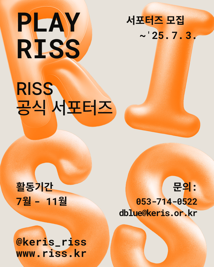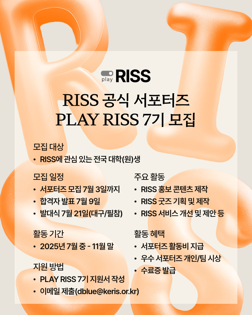 한국교육학술정보원에서 2025년 RISS 서포터즈(PLAY RISS) 7기를 모집합니다. 관심있는 학생들은 많은 참여 바랍니다.