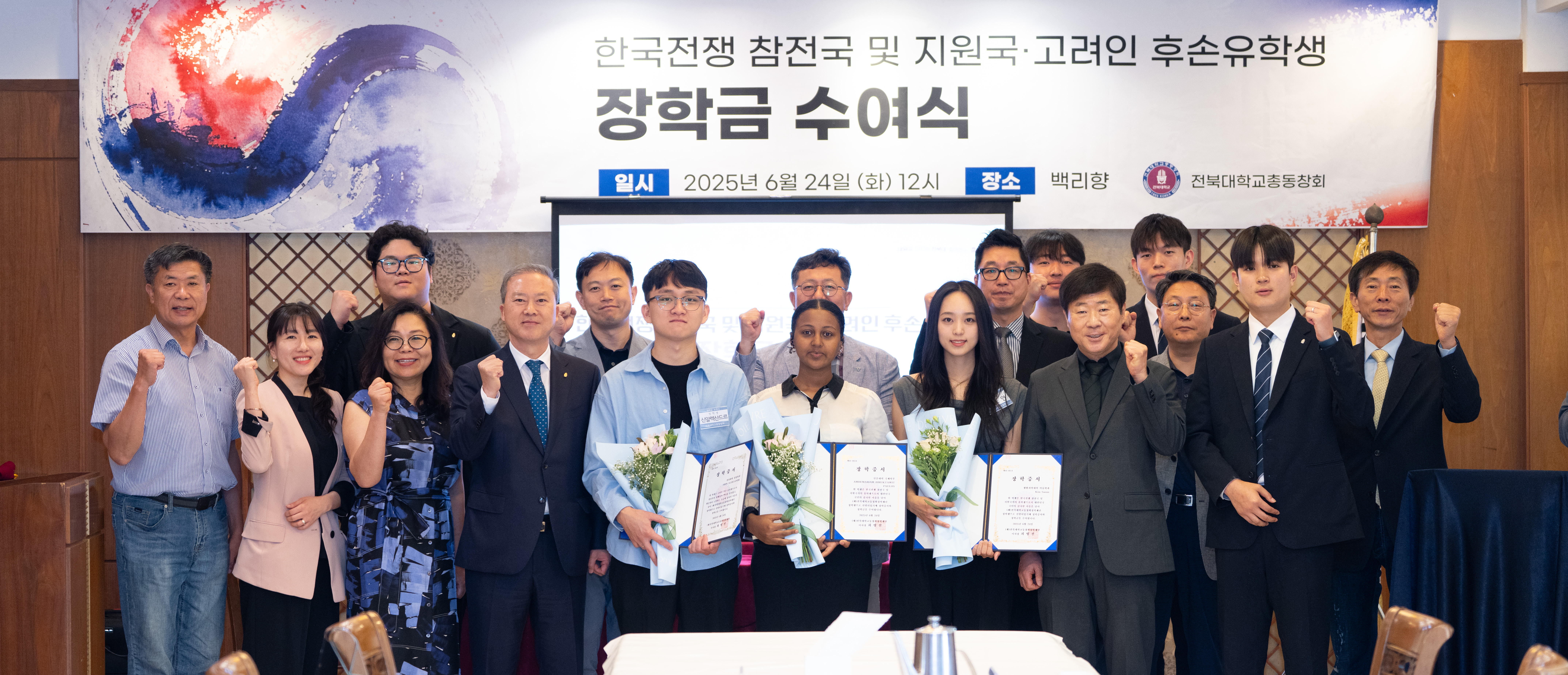 전북대학교 총동창회(회장 최병선)가 6.25 한국전쟁 기념일을 하루 앞둔 24일 6.25 전쟁 참전국 및 지원국에서 온 외국인 유학생들에게 감사의 마음을 담은 장학금을 전달했다.