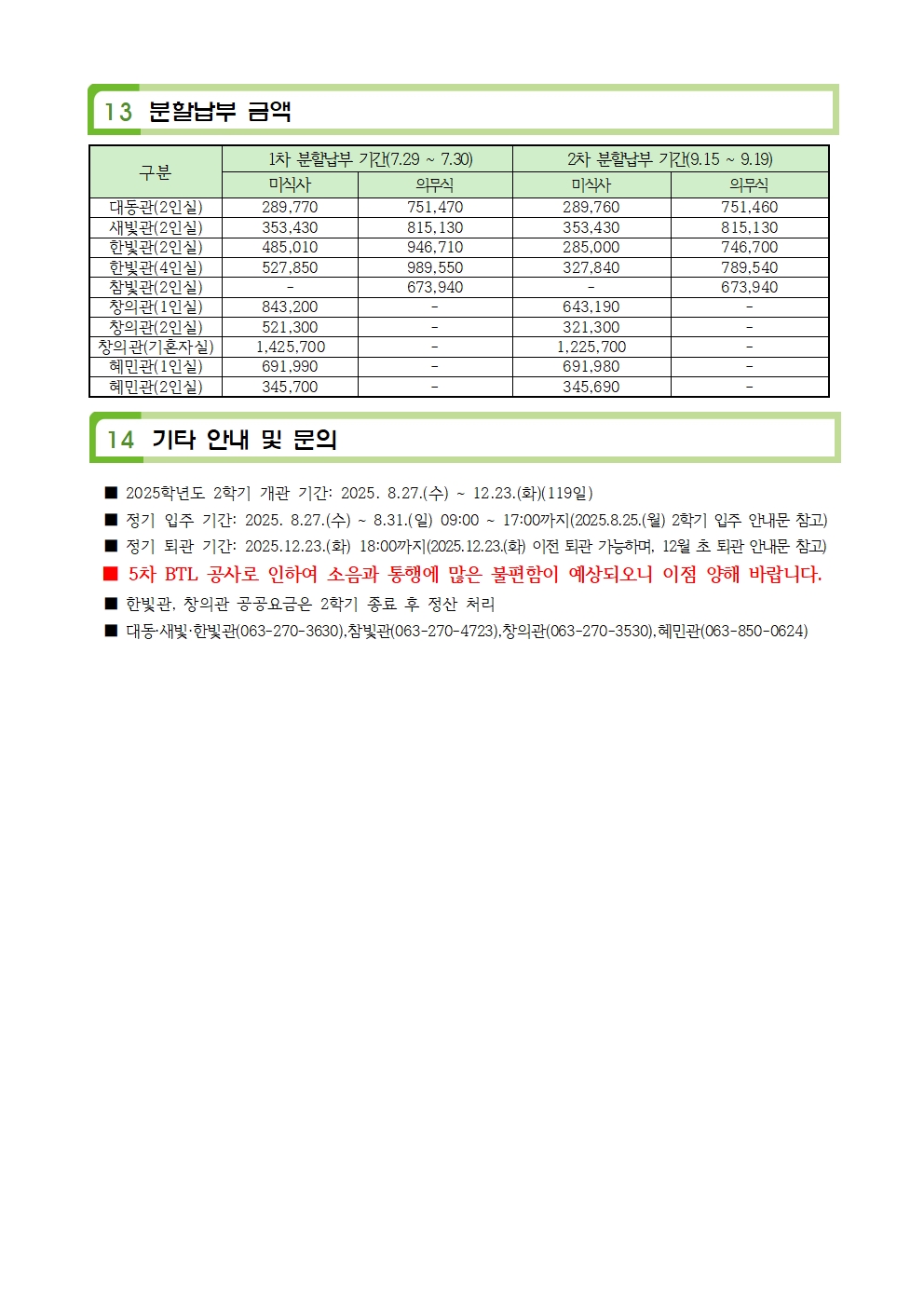 2025학년도 2학기 생활관 잔여석 신규 모집안내(전주캠퍼스)