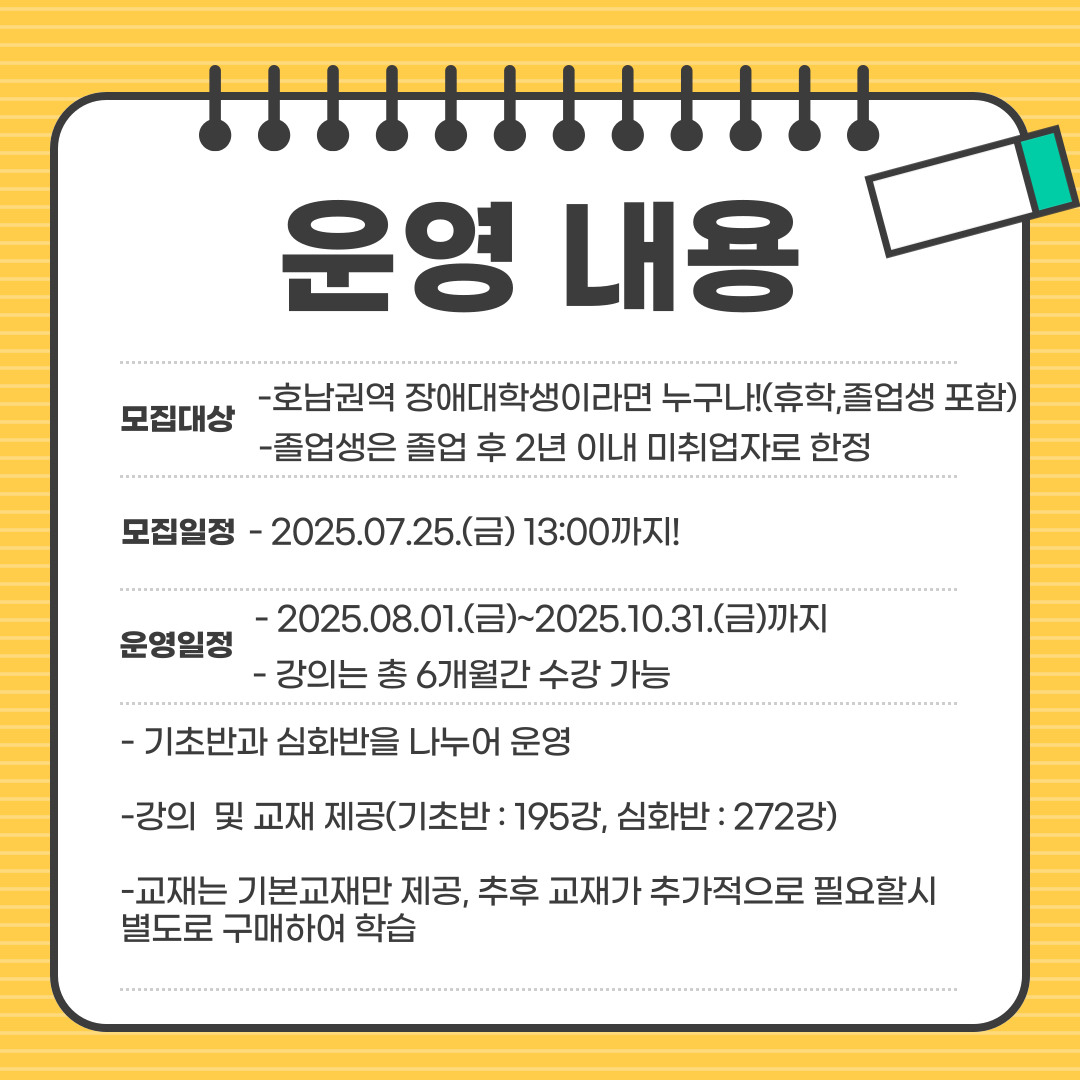 - 호남권역 장애대학생(휴학생, 졸업생 포함) 25명(기초반 : 15명, 심화반 : 10명)