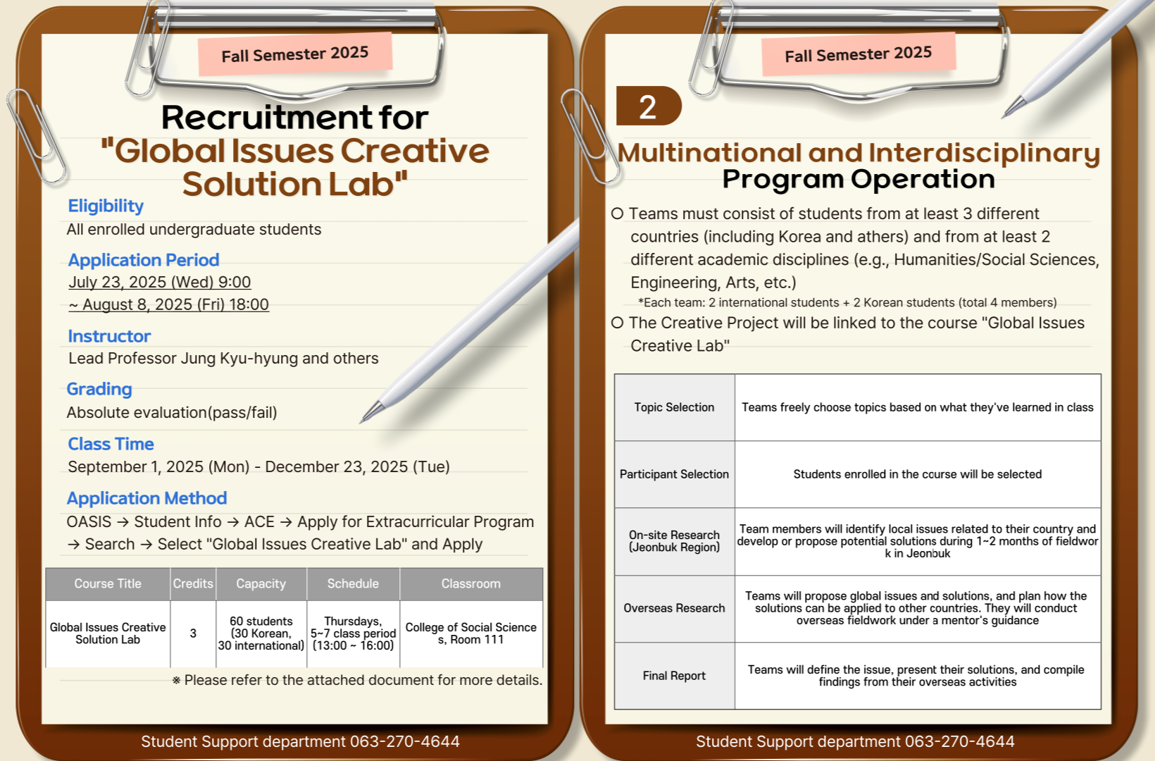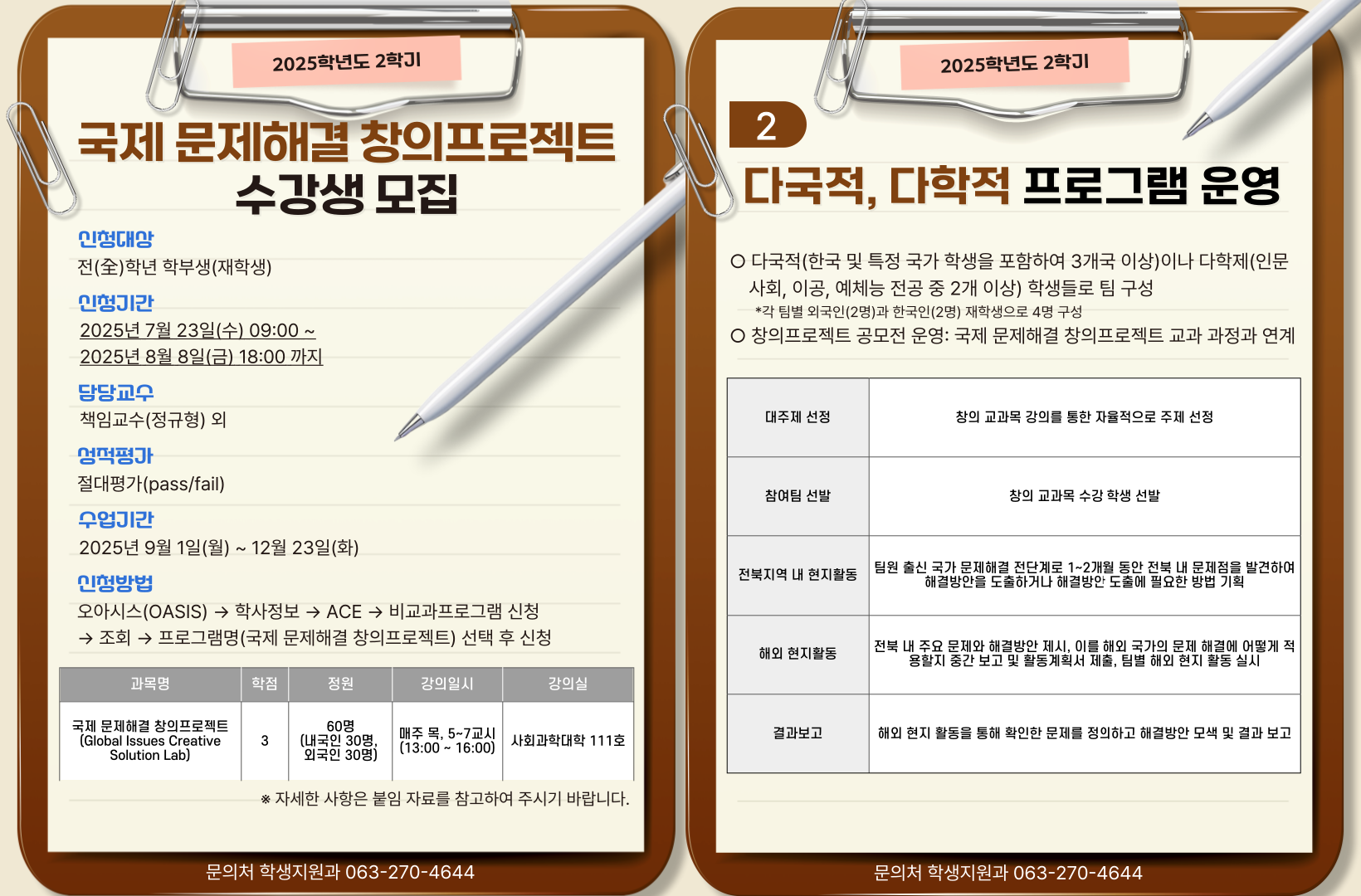2025학년도 2학기 국제 문제해결 창의프로젝트 교과목 수강생을 모집하오니 관심있는 학생들은 많은 참여 부탁드립니다.