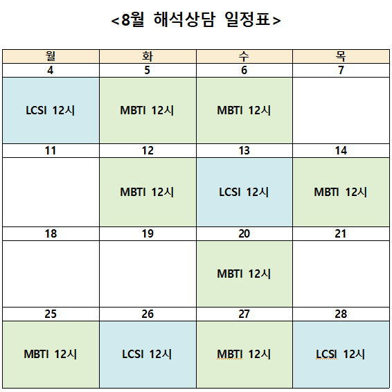 ○ 8월 심리검사 신청 일정은 8월 넷째주 월요일(8/18) 오후에 확인할 수 있습니다.