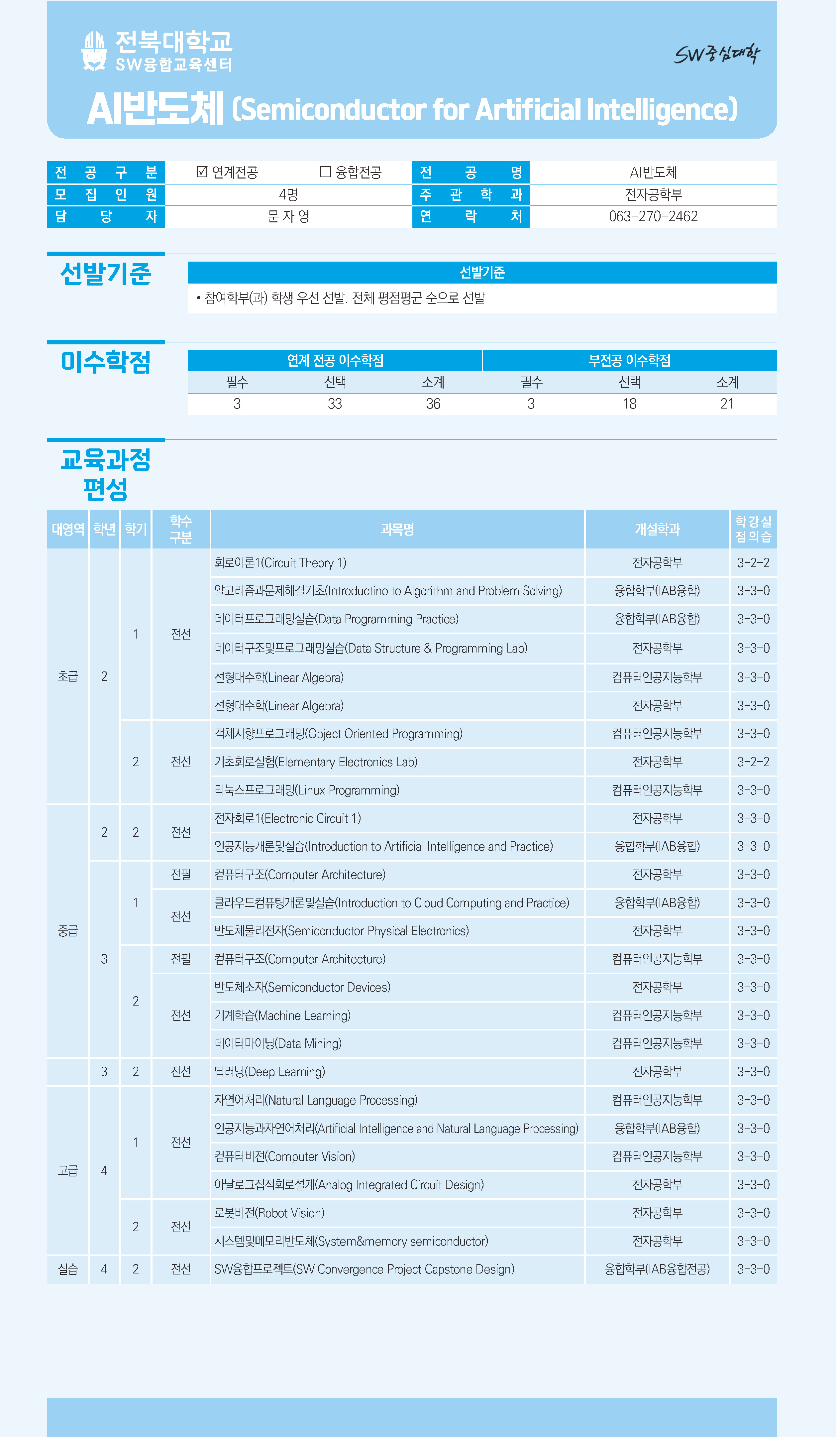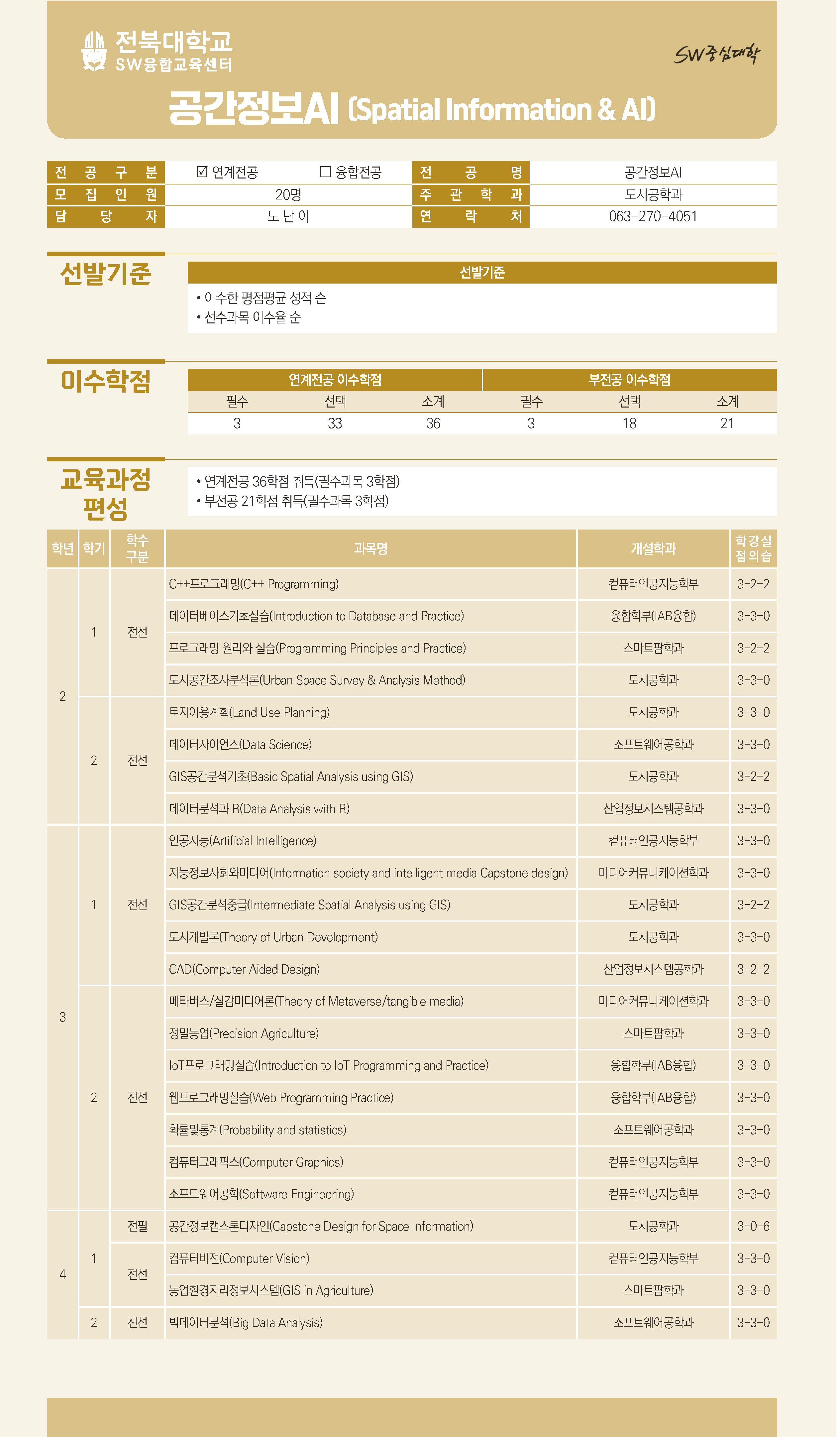 - SW연계전공: 공간정보AI, AI반도체, 스마트융합미디어학, 과학융합빅데이터, 빅데이터AI
