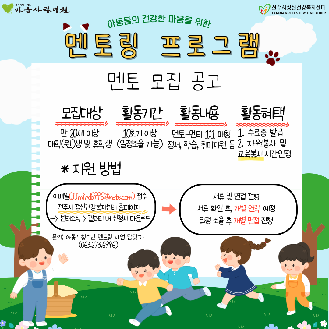 전주시정신건강복지센터 [아동 청소년] 2025년 멘토링 프로그램 '멘토' 모집합니다.