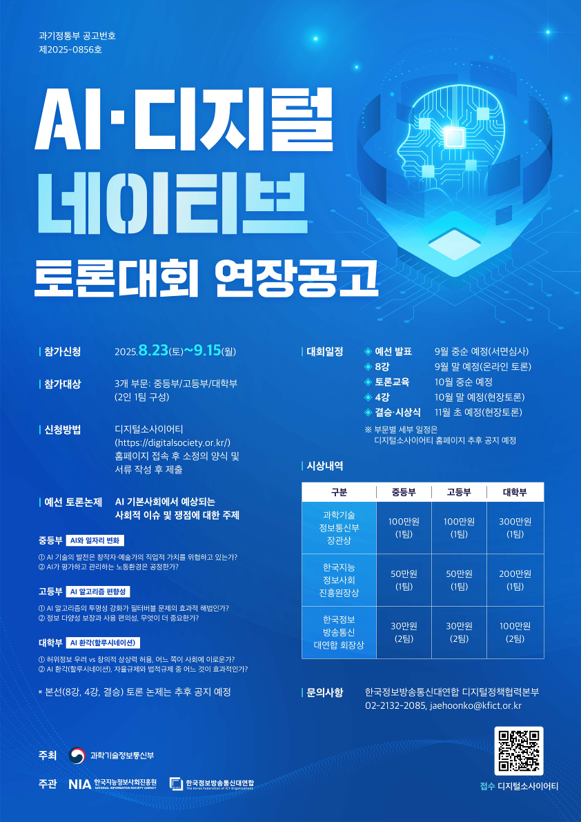 과학기술정보통신부에서 AI·디지털 네이티브 토론대회를 개최합니다. 관심있는 학생들은 많은 참여 바랍니다.