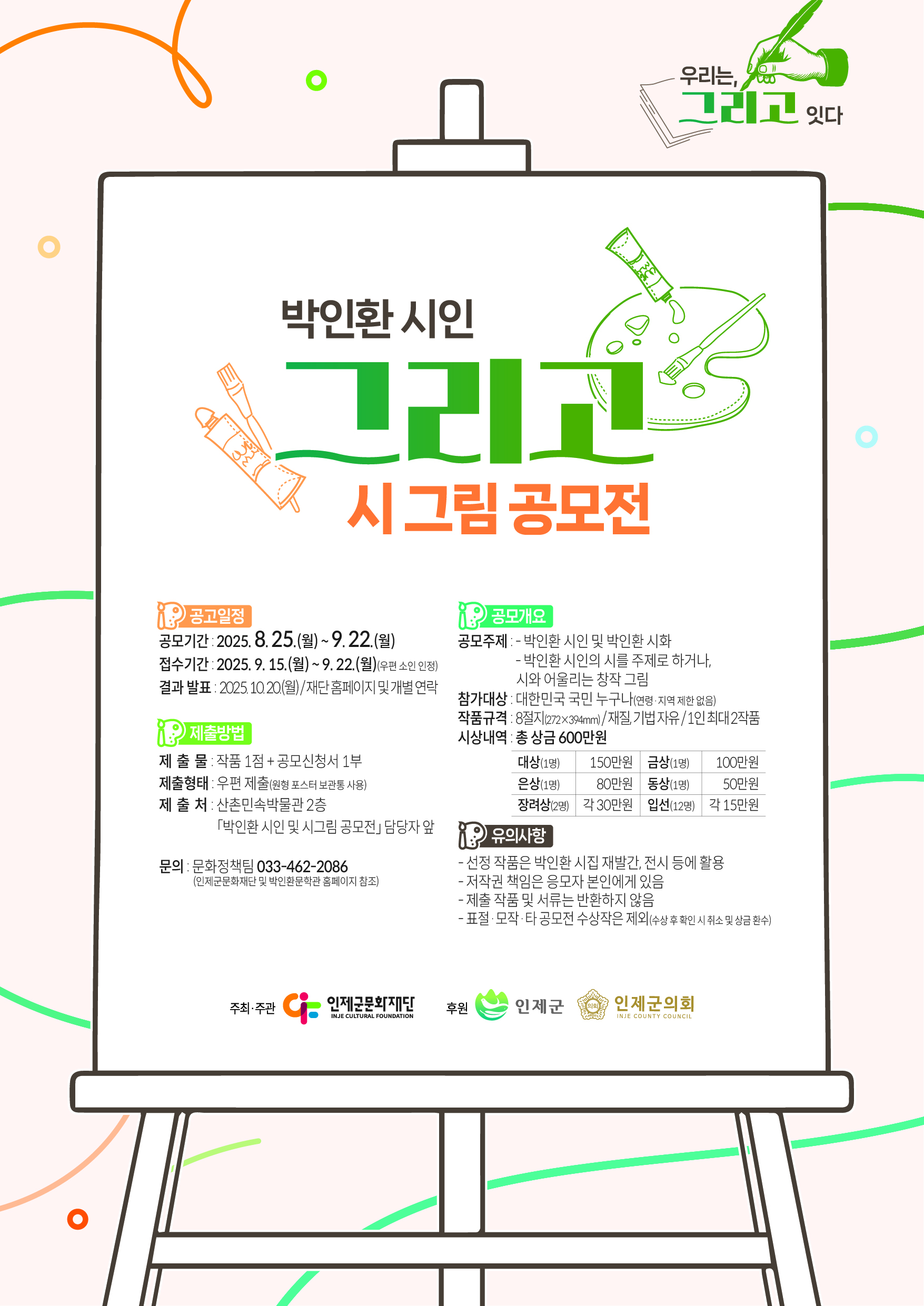 인제군문화재단에서 「박인환 시인 그리고 시 그림 공모전」을 개최합니다. 관심있는 학생들은 많은 참여바랍니다.