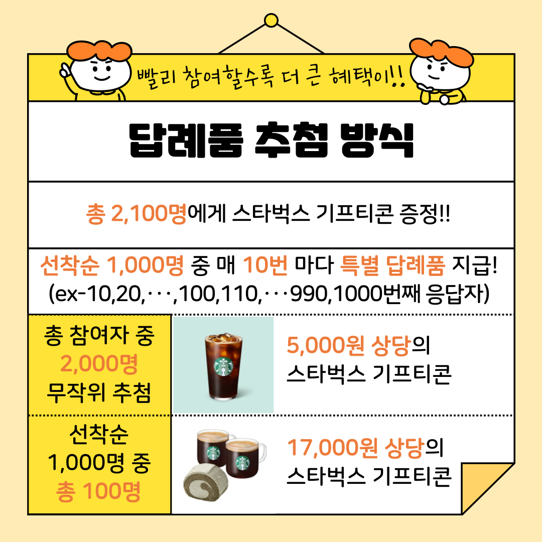 ◎ 선착순 1,000명 중 10번째 응답자 마다(10번~1000번) 17,000원 상당의 스타벅스 기프티콘 지급