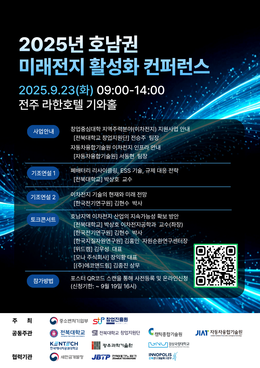 전북대학교 창업지원단에서 호남권역의 고부가가치 미래 산업을 선도하기 위한 미래전지 산업 활성화를 위한 컨퍼런스 운영을 하고자 합니다. 관심있는 학생 및 교직원께서는 많은 관심과 참여 부탁드립니다