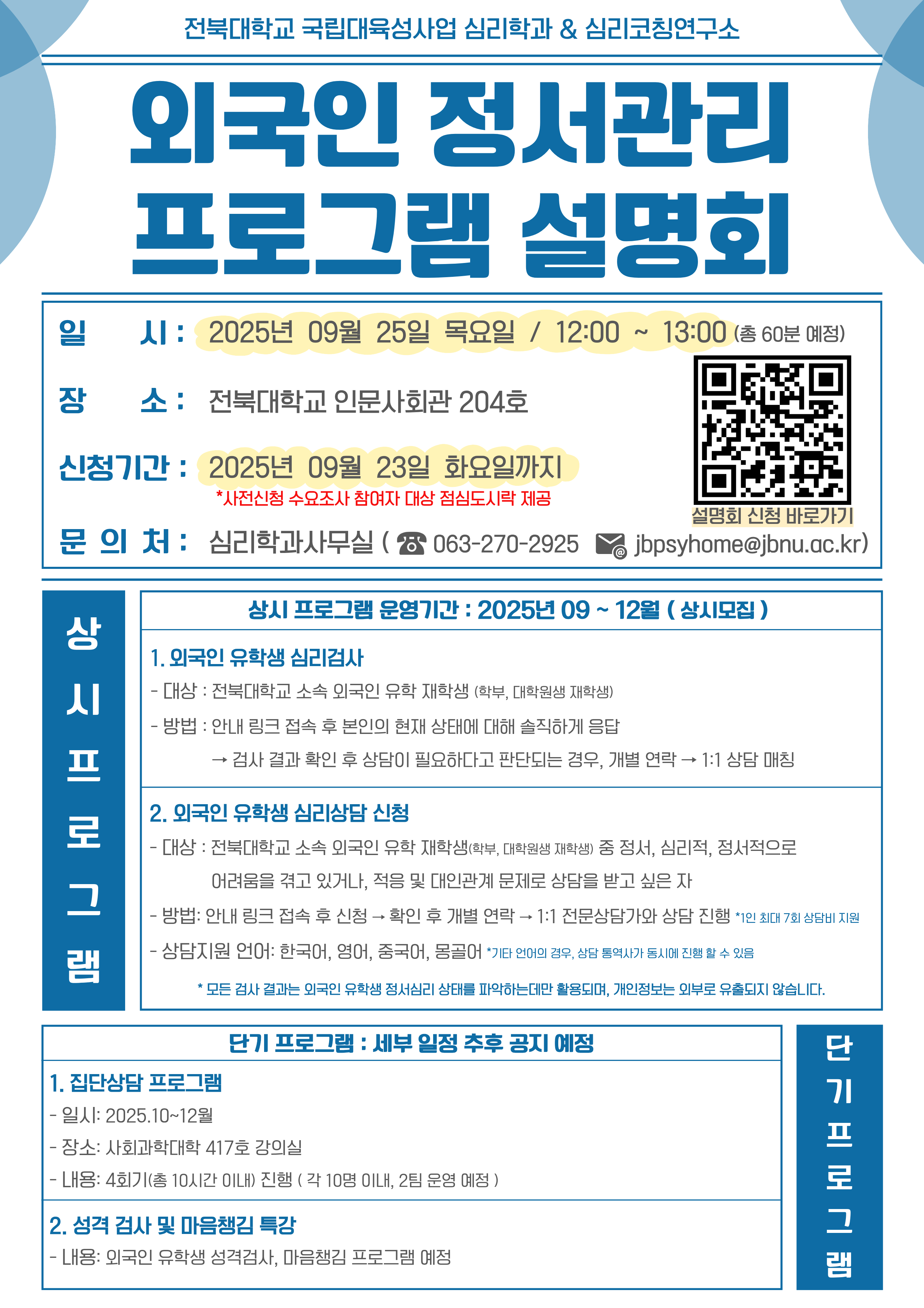 가. 행사명 : 2025학년도 외국인 유학생 정서지원 심리검사 및 상담 프로그램 설명회