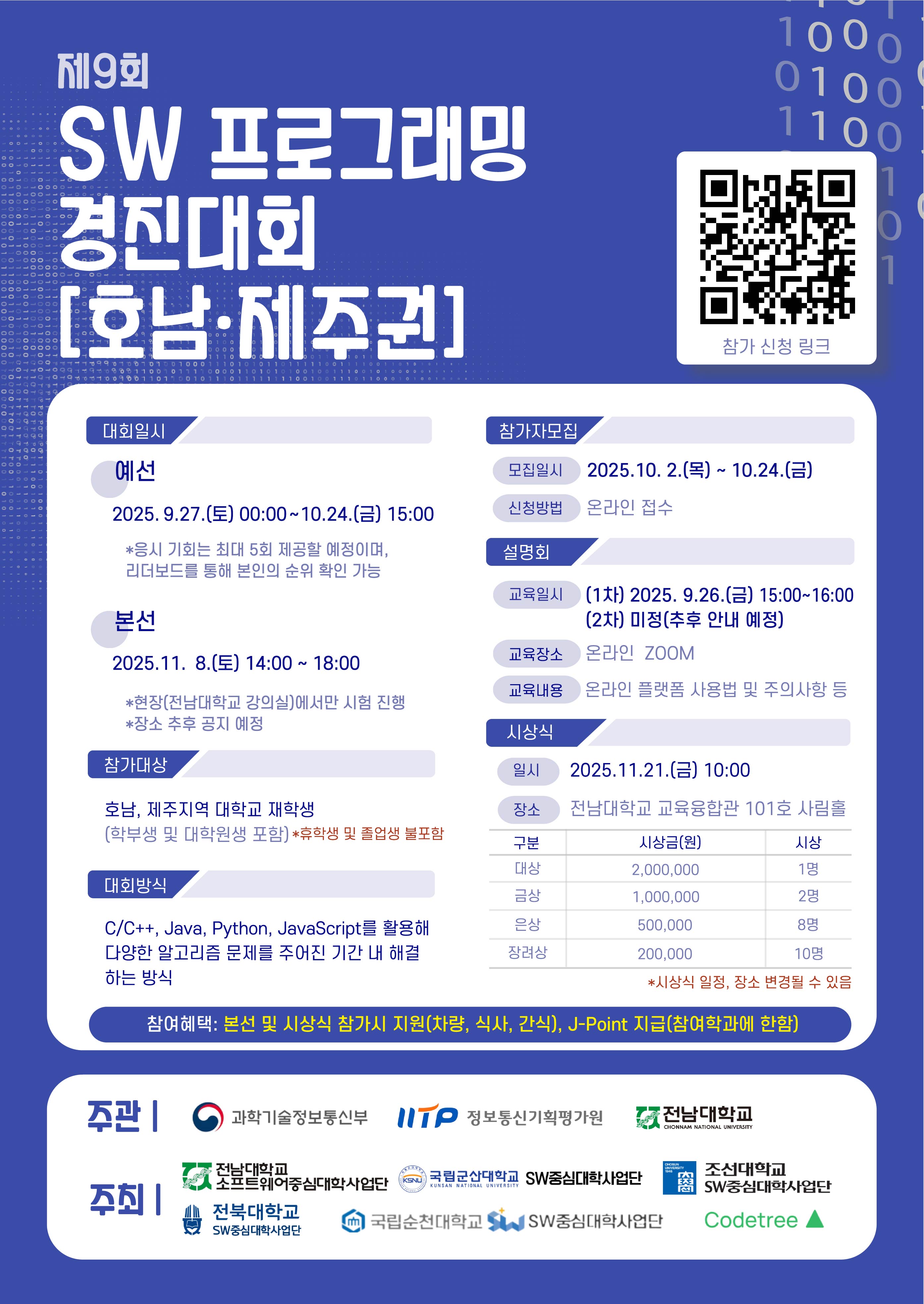 SW중심대학사업단에서는 전남대학교가 주최하고 호남·제주지역의 SW인재 발굴을 위하여 『제9회 SW프로그래밍경진대회(호남·제주권) 참가 학생을 모집하고 있으니, 관심 있는 학생들의 많은 신청 부탁드립니다.