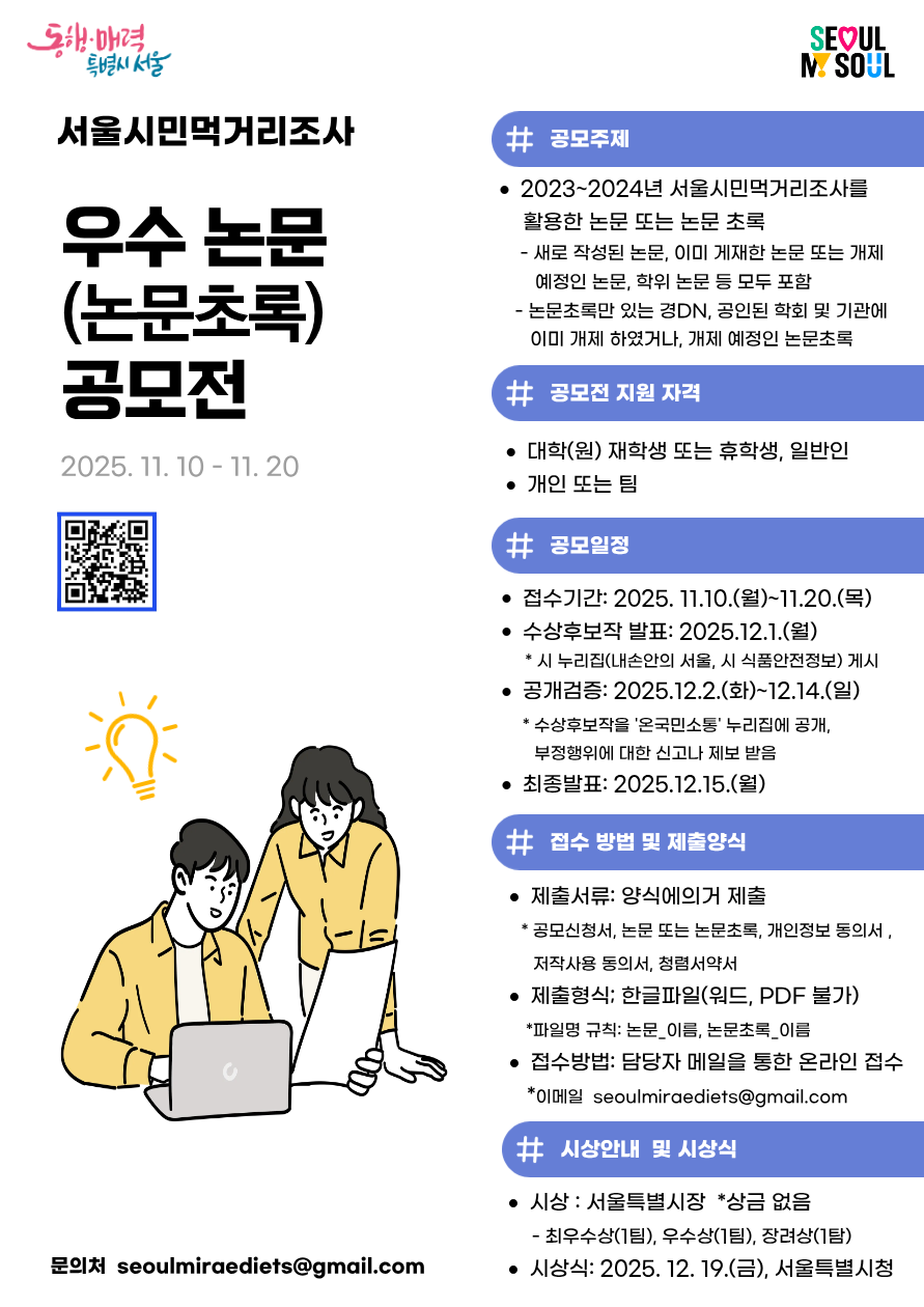 서울특별시에서 서울시민먹거리조사 우수 논문(논문초록) 공모전을 개최합니다. 관심있는 학생들은 많은 참여 바랍니다.