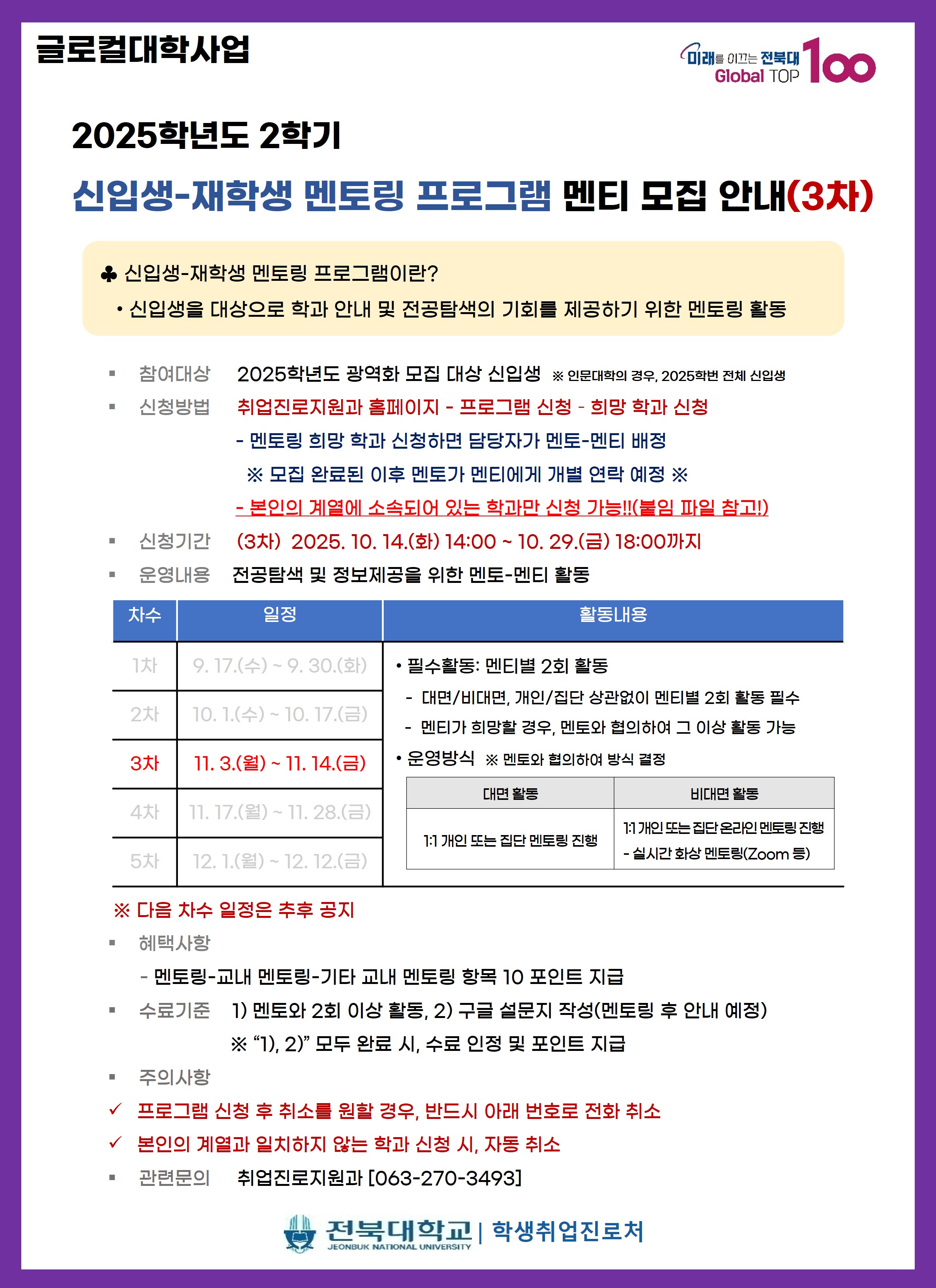 [취업진로지원과] 2025년도 2학기 신입생-재학생 멘토링 프로그램 멘티 모집(3차) 재안내