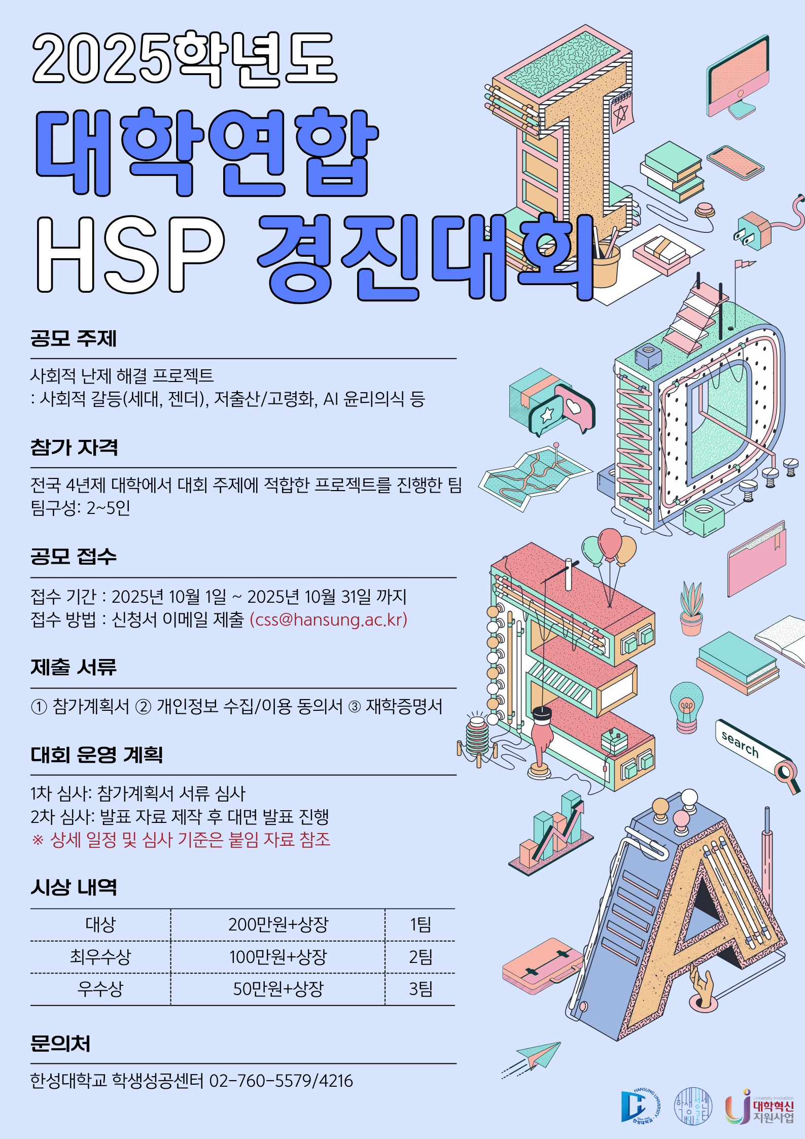 한성대학교에서 2025학년도 대학연합 HSP 경진대회를 개최합니다. 관심있는 학생들은 많은 참여 바랍니다.