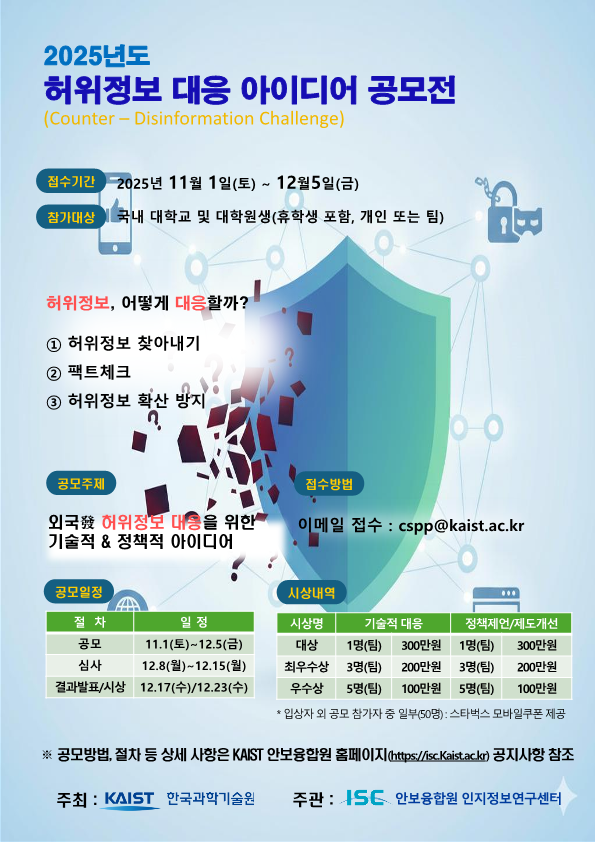 한국과학기술원(kaist)에서 「허위정보 대응 아이디어 공모전」을 개최합니다. 관심있는 학생들은 많은 참여 바랍니다.