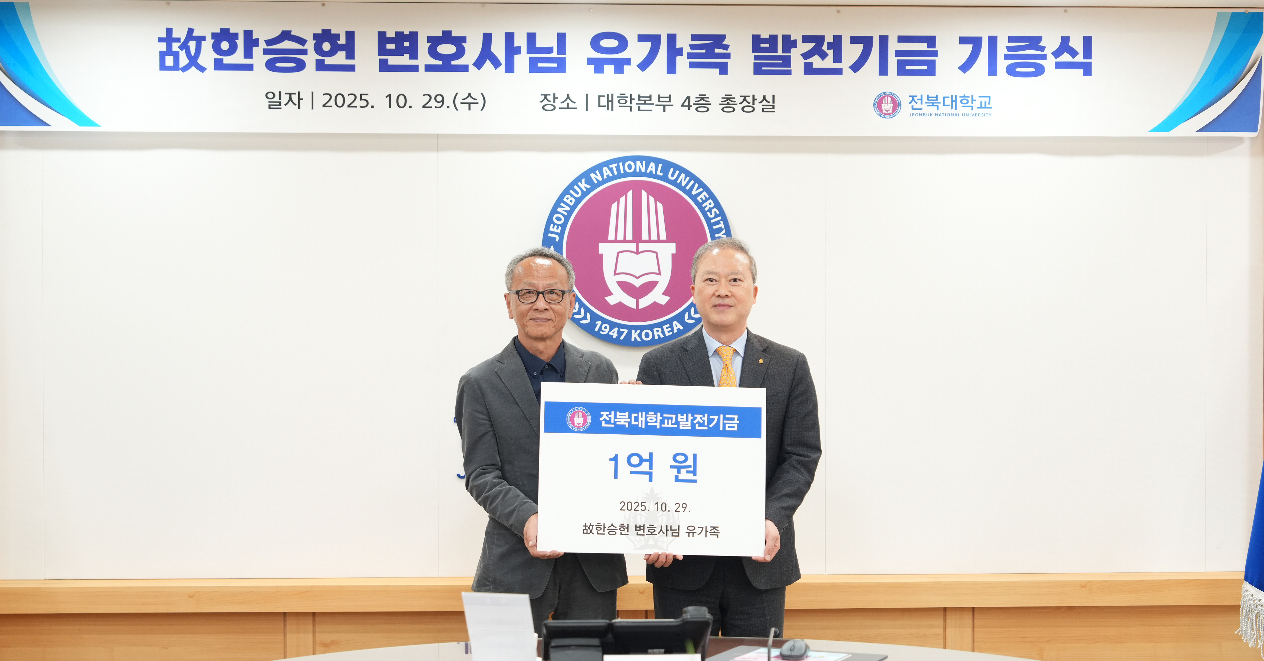 이에 전북대는 10월 29일 대학본부 총장실에서 발전기금 기증식을 개최했다. 이날 행사에는 양오봉 총장과 대학 주요 보직자, 고인의 유가족이 참석해 감사패 전달과 함께 한승헌도서관 발전 방향을 논의하는 시간을 가졌다.
